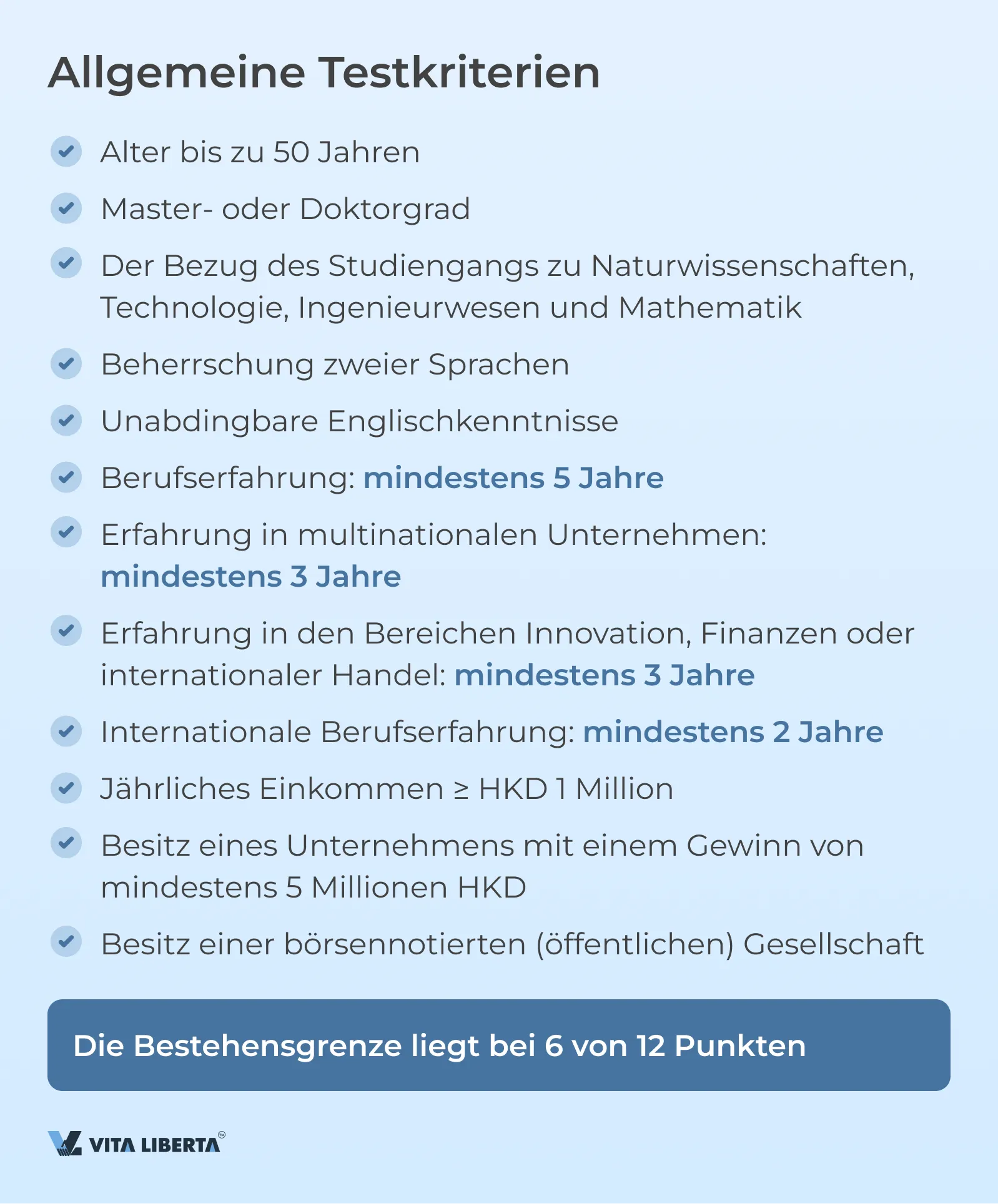 - Das Jahreseinkommen muss im Jahr vor Antragstellung mindestens 1 Million HK$ oder den entsprechenden Gegenwert in Fremdwährung betragen.