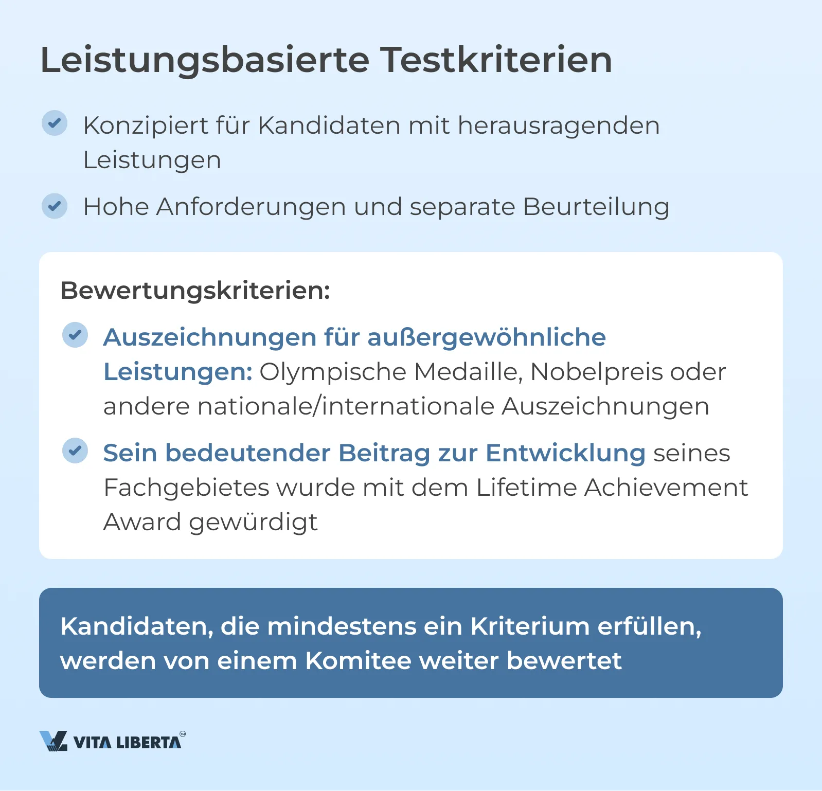 Das Programm steht auch Personen mit außergewöhnlichen Talenten und Fähigkeiten offen, die herausragende Leistungen nachweisen können. Für diese Personen ist ein separater, leistungsorientierter Test mit strengen Anforderungen erforderlich. Bewerber, die mindestens eines der Kriterien erfüllen, werden von einem Gremium für eine weitere Prüfung ausgewählt. Bewerbungen, die die Kriterien nicht erfüllen, werden abgelehnt.