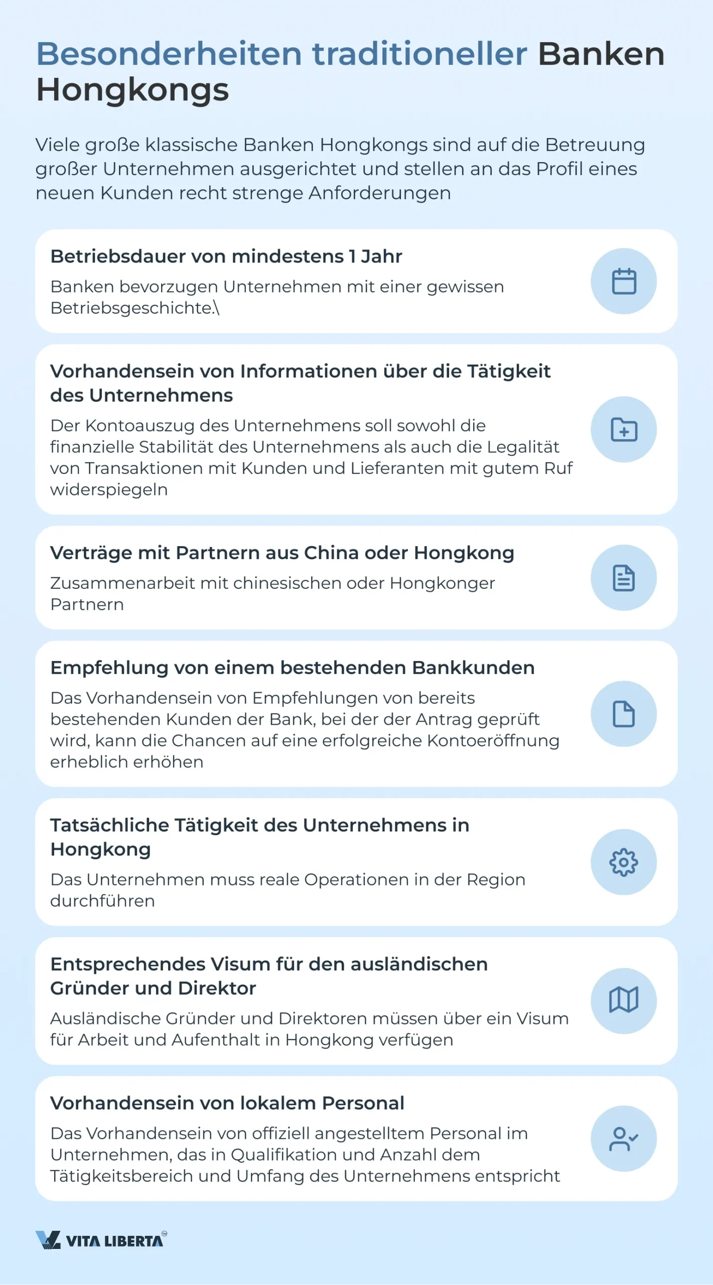 Viele große klassische Banken Hongkongs sind auf die Betreuung großer Unternehmen ausgerichtet und stellen strenge Anforderungen an das Profil eines neuen potenziellen Kunden. Zunächst müssen Unternehmen eine Betriebsgeschichte von mindestens einem Jahr vorweisen, da Banken bevorzugt mit Organisationen arbeiten, die über einen bestimmten Ruf und Stabilität verfügen. Ebenso wichtig ist das Vorhandensein detaillierter Informationen über die Tätigkeit des Unternehmens: Der Kontoauszug muss finanzielle Stabilität und die Legalität von Transaktionen mit Kunden und Lieferanten mit gutem Ruf nachweisen.