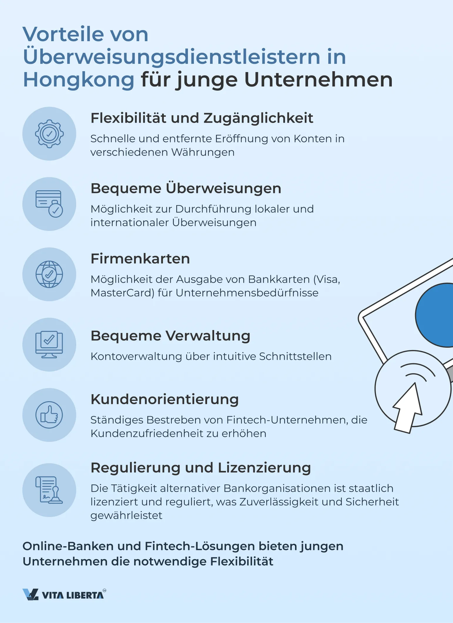 Für Unternehmen, die den strengen Anforderungen traditioneller Banken nicht entsprechen, werden Online-Banken und Zahlungssysteme (Überweisungsdienstleister), vertreten durch Fintech-Unternehmen mit MSO- oder SVF-Lizenzen, zu einer hervorragenden Alternative. Diese innovativen Lösungen können klassische Banken ersetzen, indem sie eine breite Palette von Dienstleistungen anbieten, einschließlich nationaler und internationaler Überweisungen, Währungsumtausch und sicherer Aufbewahrung von Geldmitteln.