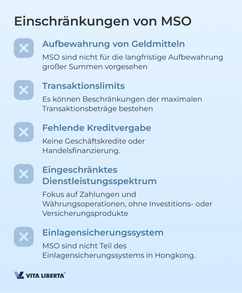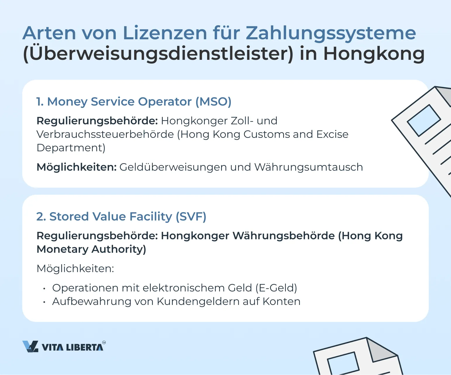 - MSO (Money Service Operator): Eine Lizenz, die von der Hongkonger Zoll- und Verbrauchssteuerabteilung reguliert wird und Geldüberweisungen und Devisenwechsel ermöglicht. Sie bietet jedoch begrenzte Möglichkeiten zur Aufbewahrung von Mitteln und zur Erbringung von Dienstleistungen.