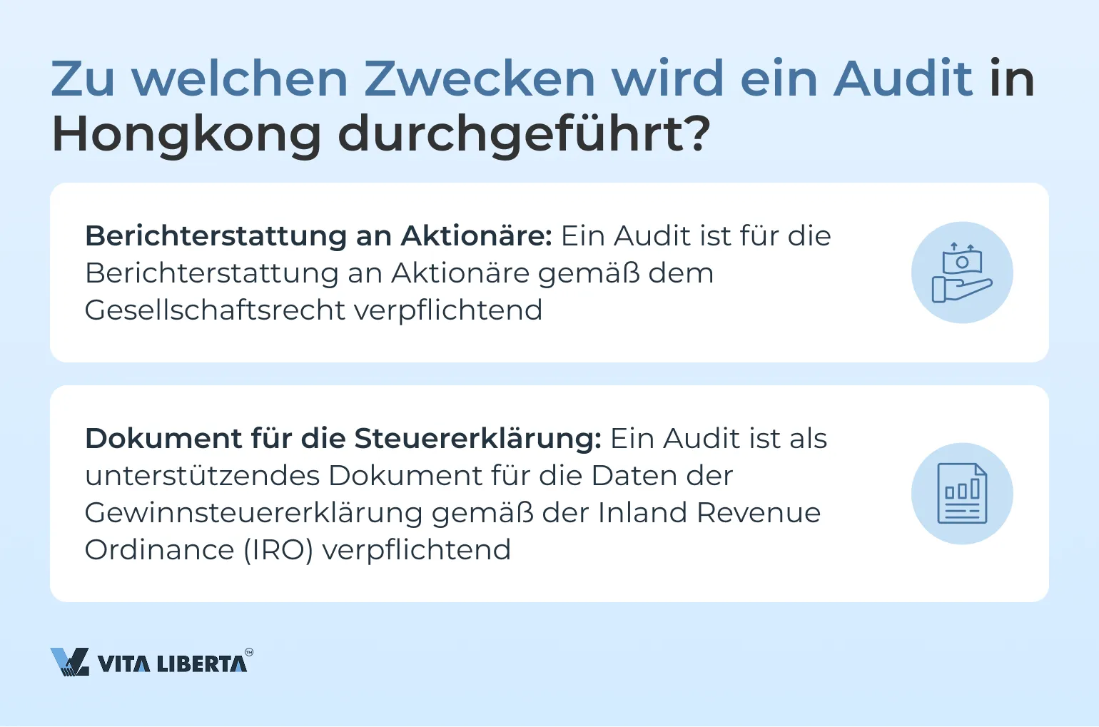 Gemäß der Hong Kong Companies Ordinance (CO) ist die jährliche Prüfung der Finanzberichterstattung für alle Unternehmen verpflichtend. Zusätzlich zu dieser Anforderung verlangt die Inland Revenue Ordinance (IRO) von Unternehmen in Hongkong, geprüfte Finanzberichte bei der Einreichung der Steuererklärung (PTR) vorzulegen.