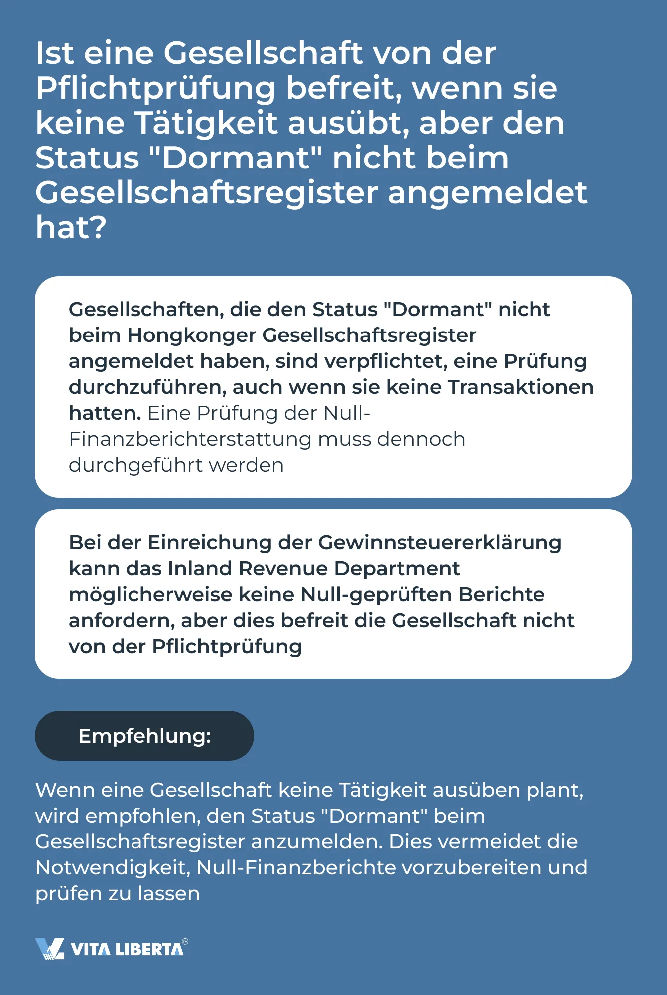 Die Tatsache, dass eine Hongkonger Gesellschaft keine Tätigkeit ausübt und deren Gründer und Leitung keine speziellen Beschlüsse gefasst und das Hongkonger Gesellschaftsregister nicht über den Dormant-Status informiert haben, ist kein Grund, warum die Gesellschaft von der Pflichtprüfung ihrer Berichterstattung befreit werden könnte.