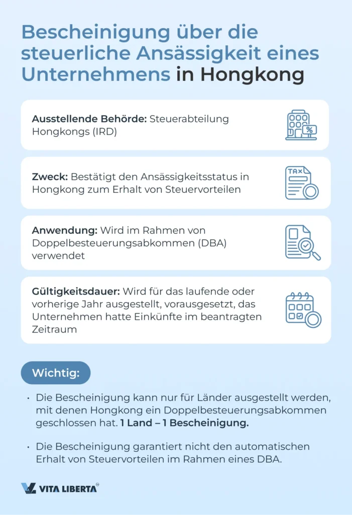 Die Bescheinigung über die steuerliche Ansässigkeit (Certificate of Residence, CoR) ist ein Dokument, das den Status als Ansässiger Hongkongs zum Erhalt von Steuervorteilen im Rahmen von Doppelbe-steuerungsabkommen (DBA) bestätigt. Sie dient als Nachweis der Ansässigkeit und kann für das lau-fende oder vorherige Jahr für Länder ausgestellt werden, mit denen Hongkong solche Abkommen ge-schlossen hat.
