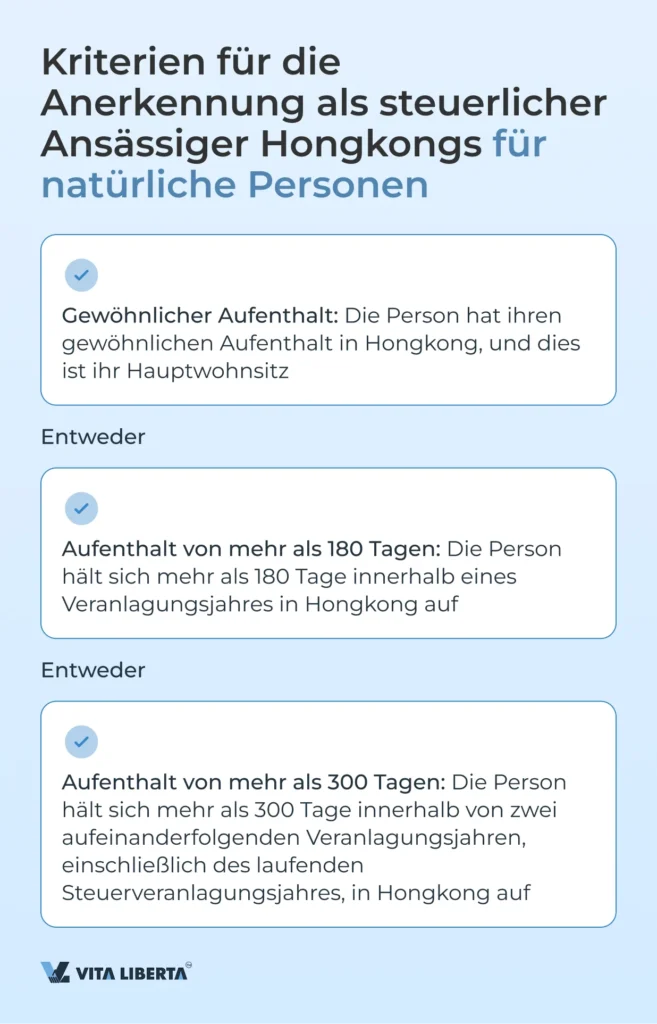 Für natürliche Personen: Es ist entweder ein gewöhnlicher Aufenthalt in Hongkong, ein Aufenthalt von mehr als 180 Tagen pro Jahr oder mehr als 300 Tage innerhalb von zwei Jahren erforderlich. Für juristische Personen: Das Unternehmen muss in Hongkong registriert sein oder vom Hoheitsgebiet Hongkongs aus geleitet und kontrolliert werden.