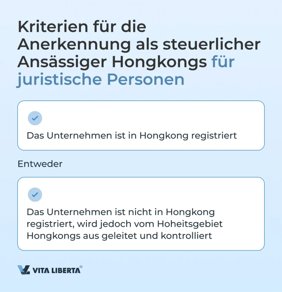 Für juristische Personen gelten etwas andere Anforderungen, und wenn eine davon erfüllt ist, wird das Unternehmen als in Hongkong ansässig anerkannt: