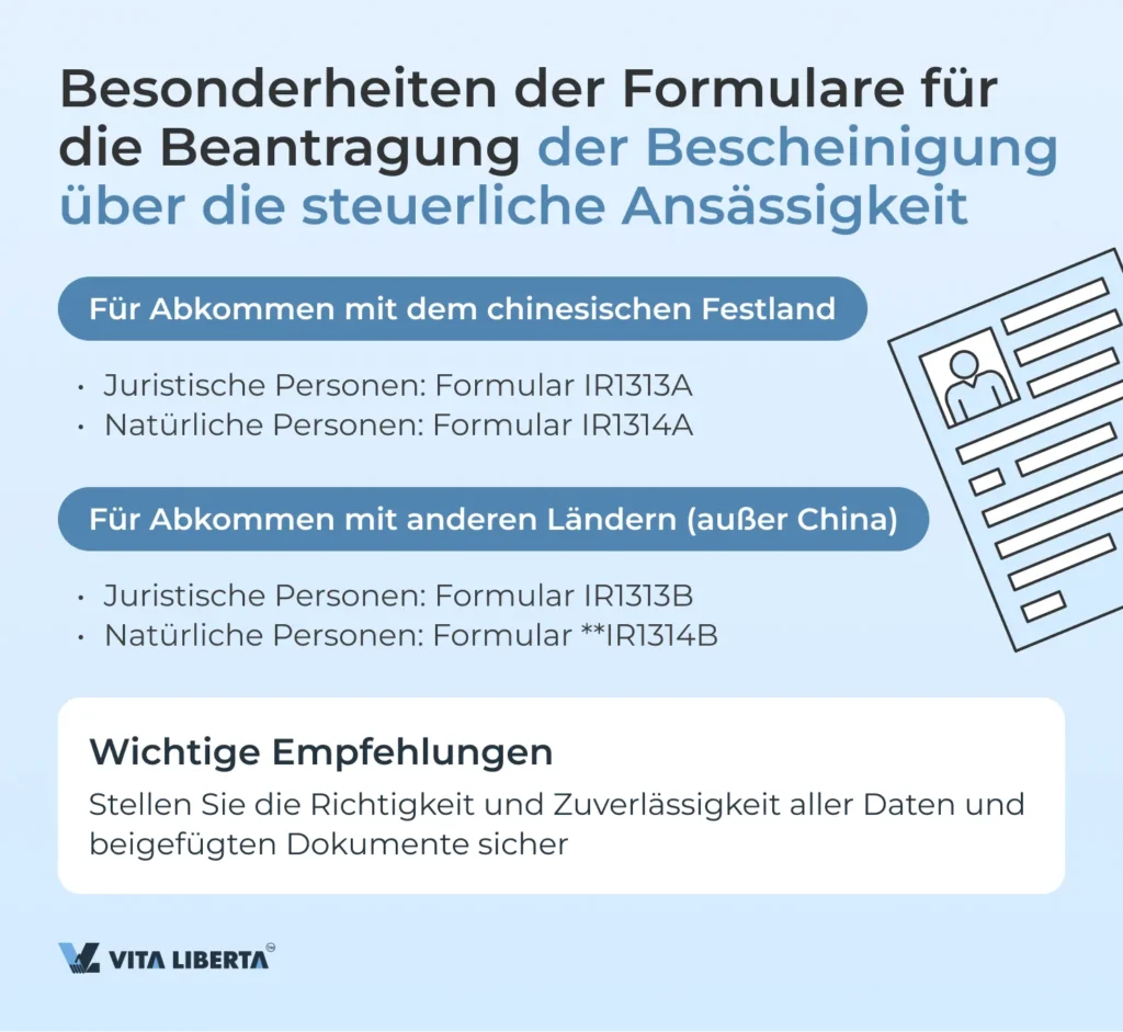 Besonderheiten der Formulare IR1313A, IR1313B, IR1314A, IR1314B (Antrag auf eine Bescheinigung des Ansässigkeitsstatus)
