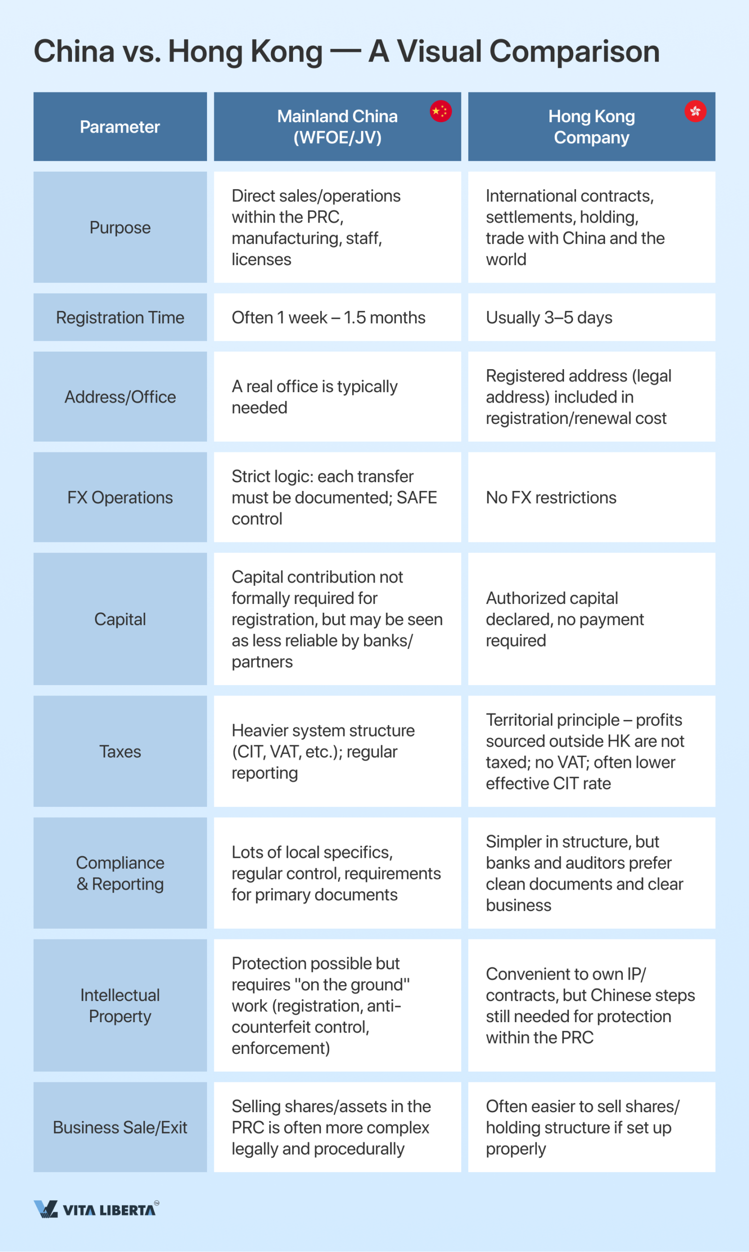 Mainland China and Hong Kong solve different problems, so the choice shouldn’t be “where is it easier,” but “where is the result needed.” China is direct access to the domestic market, manufacturing, personnel, and contracts within the PRC, but you pay for it with time, office, paperwork, and strict rules on currency and reporting. Hong Kong is a convenient international platform for contracts, payments, holding, and trade with China without excessive bureaucracy, but it won’t replace a real presence if you operate inside China. The most practical path for many is to start with Hong Kong for international operations and connect a Chinese WFOE when stable volume appears and the need to “set down roots” in the PRC arises.