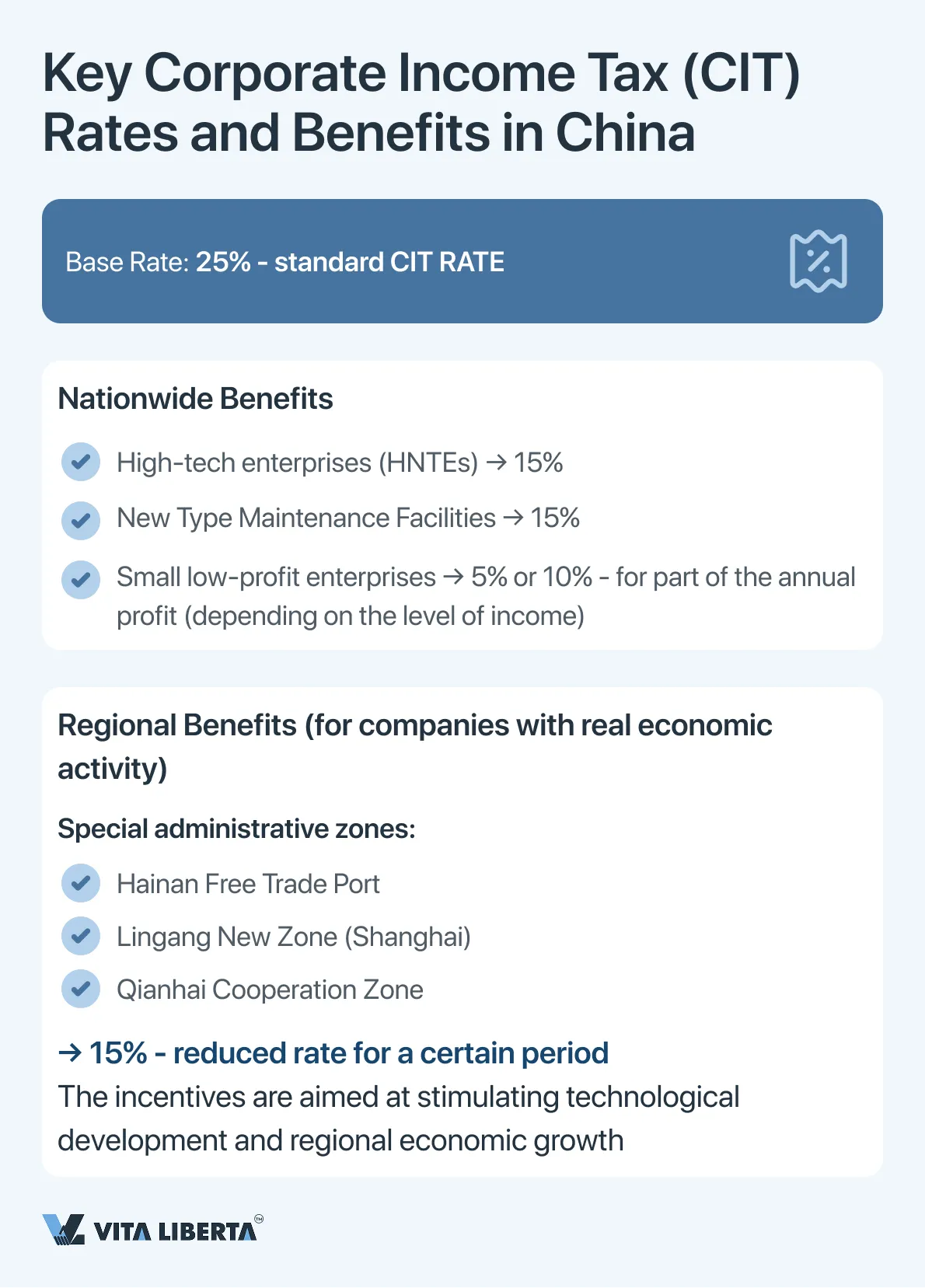 - Regional Benefits: Special Administrative Zones (e.g. Hainan Free Trade Port, Shanghai Lingang New Zone, Qianhai Cooperation Zone) offer incentive companies with real economic activity (operational substance) a rate of 15% for a certain period.
