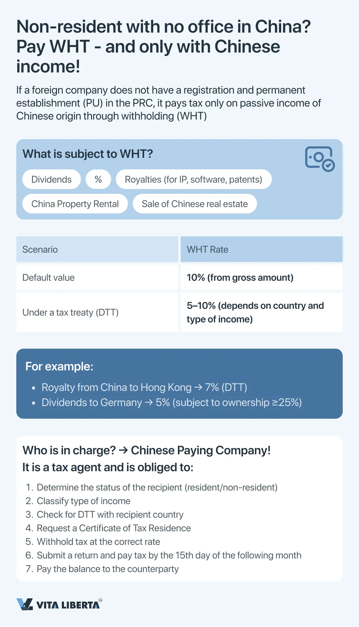 For foreign companies that are not tax residents of the PRC (non-TRE) and do not have a permanent establishment (PI) in China, a special regime of taxation of income of Chinese origin is applied. The main mechanism is Withholding Tax (WHT).