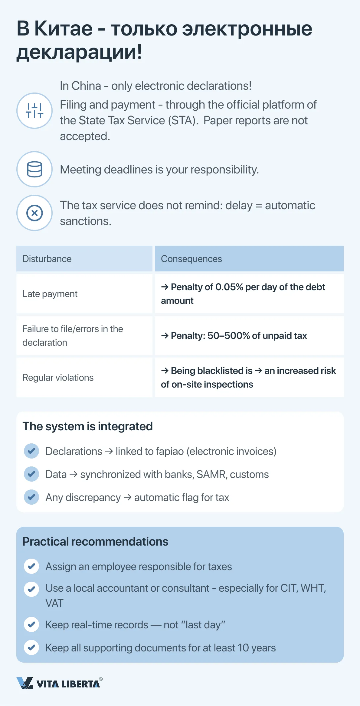 All actions are performed through the online platform of the State Tax Administration (STA). The delay entails the automatic accrual of penalties (0.05% per day) and the risk of fines.