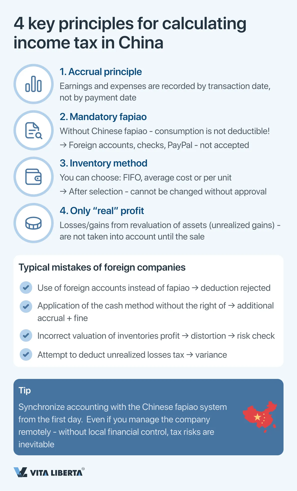 Any deductible expenses to reduce the tax base must be confirmed by official Chinese tax invoices (fapiao). Checks, foreign invoices, PayPal payments, etc. are not accepted by the tax authorities as a basis for deduction. The absence of a correct fapiao makes expenses non-deductible.