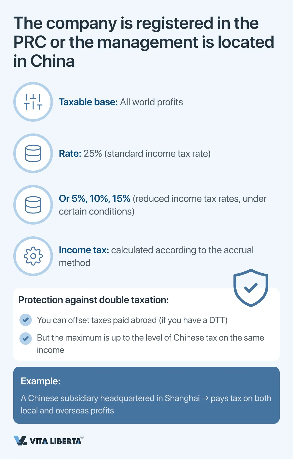 This category includes enterprises registered in accordance with the legislation of the People’s Republic of China or having actual management bodies in China. TREE are subject to the principle of worldwide taxation and are required to declare all global profits received. To prevent double taxation, Chinese law provides for a mechanism for offsetting foreign taxes paid abroad on income of foreign origin. However, the amount of credit is limited to the amount of tax that would be payable in China on the same amount of income. Tax calculated at the applicable tax rates