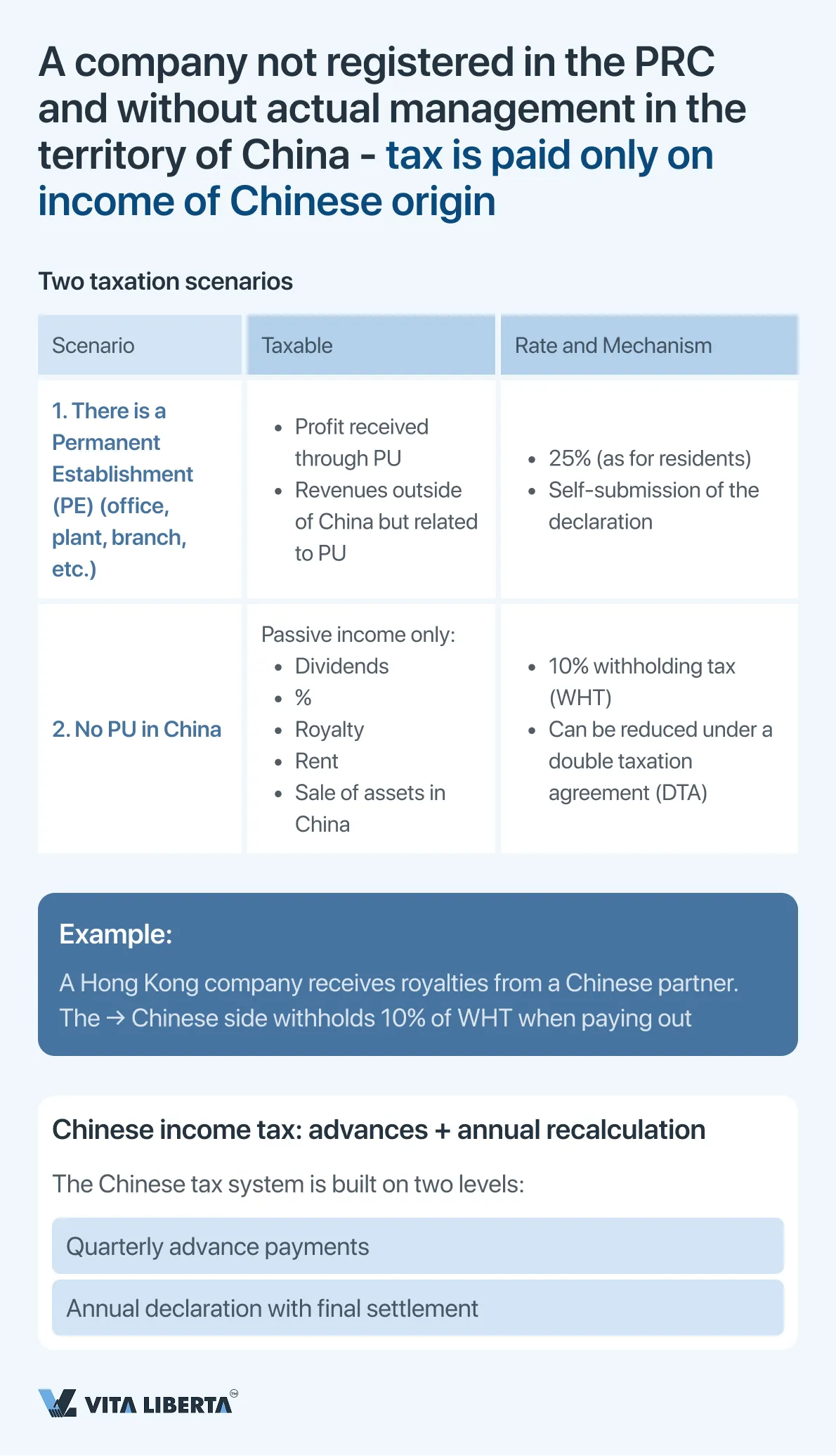 Non-Tax Resident Enterprise (non-TRE): These are companies that are not registered in China and are managed from abroad. They are taxed only on income of Chinese origin. If a non-TRE has a permanent establishment (office, factory) in China, it pays tax on the profits of that establishment. If there is no permanent establishment, then passive income (dividends, royalties, interest) is subject to withholding tax (usually 10%).