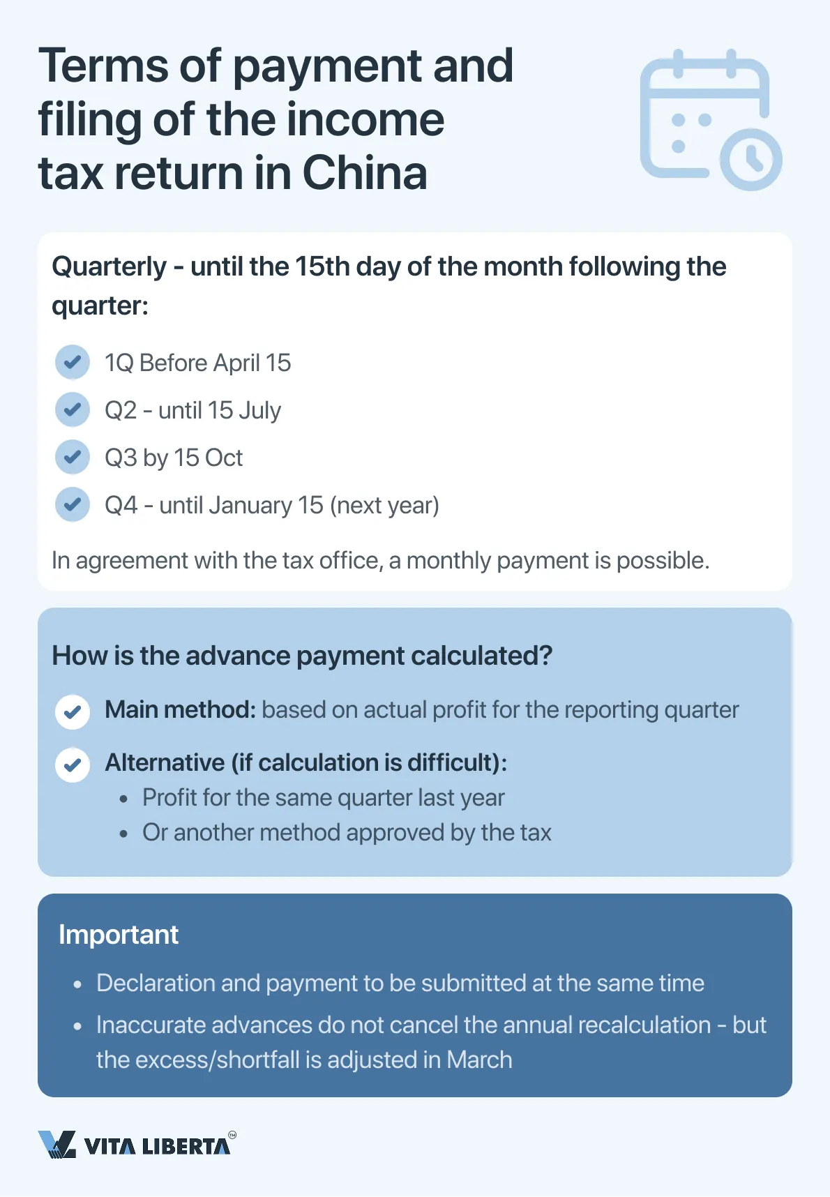 China’s corporate income tax (CIT) administration is based on the principle of prepayments (advances) and final annual calculation. This system ensures a uniform flow of funds to the budget and allows companies to adjust their liabilities based on actual financial results for the reporting period.