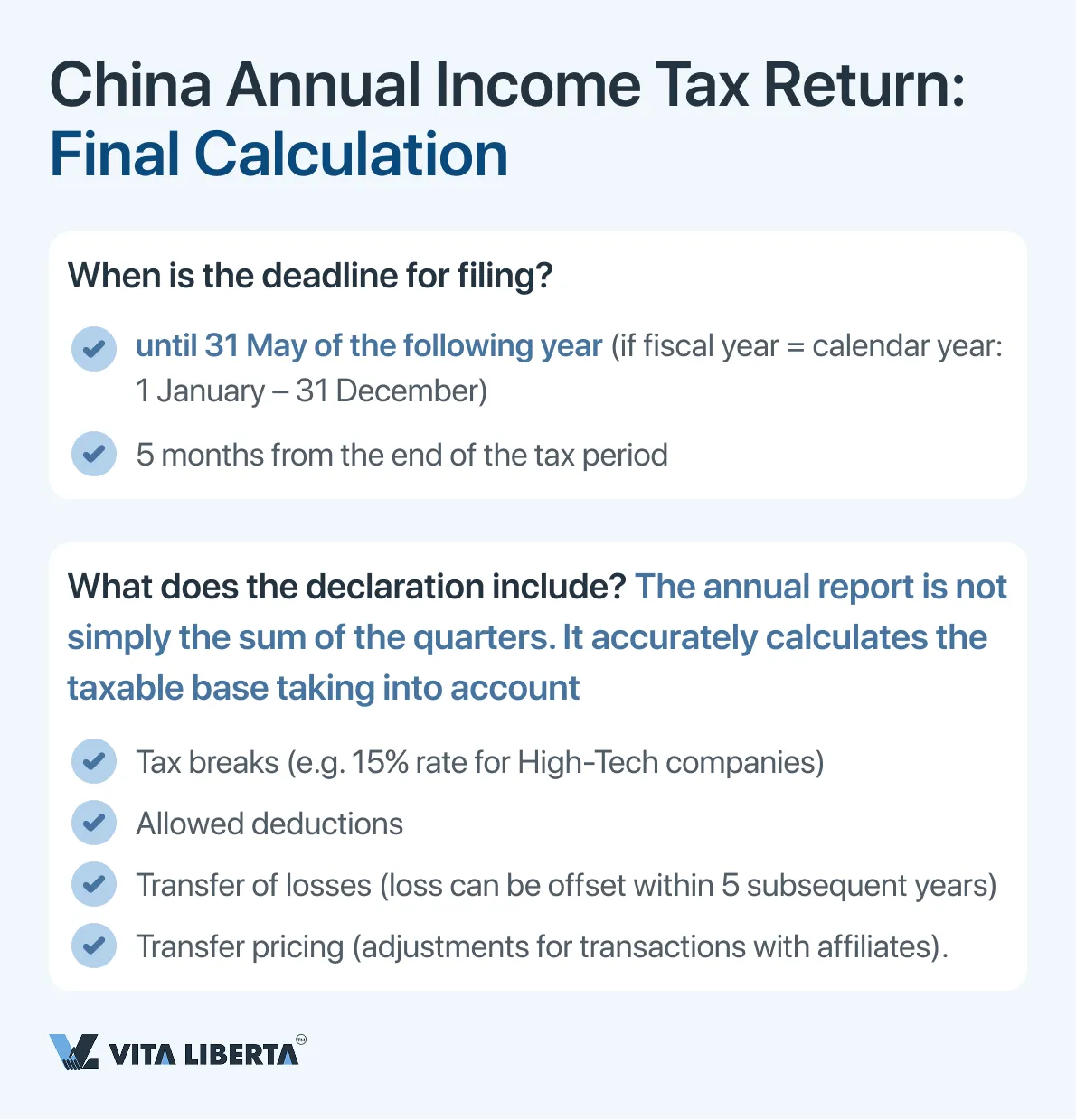 - Table of contents: This is the key stage at which the final tax base is determined, taking into account all benefits (for example, by HNTE status), deductions (including R&D super deduction), loss carry-over (up to 5 years) and adjustments. The declaration is often required to be accompanied by an audit report from a licensed Chinese firm.