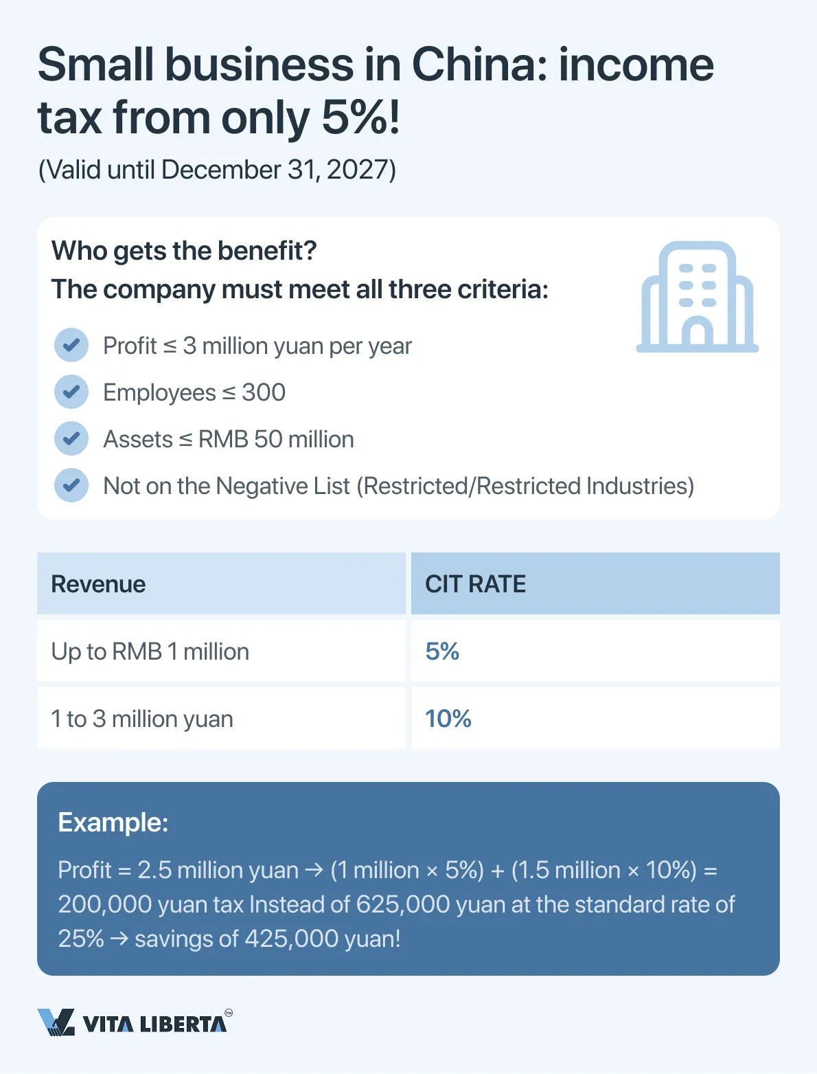 For such companies that meet the criteria (annual taxable profit up to 3 million yuan, restrictions on the number of employees and assets), there are preferential effective CIT rates of 5% on part of income up to 1 million yuan and 10% on part from 1 to 3 million yuan.