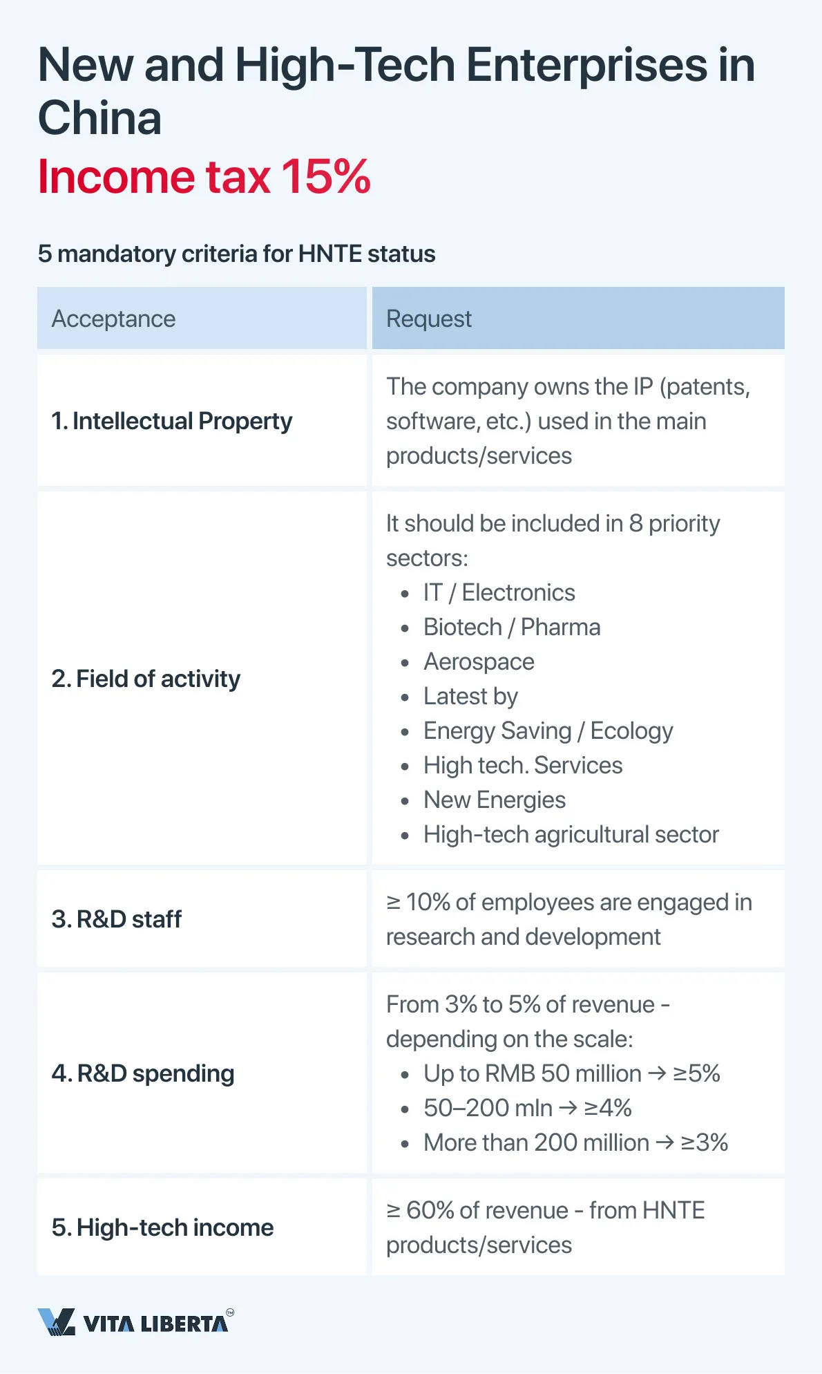 The company must meet a number of strict criteria, including ownership of key intellectual property, working in a priority high-tech industry, having a certain share of employees in R&D (≥10%), the level of R&D spending on revenue (from 3% to 5%) and the share of high-tech income (≥60%).