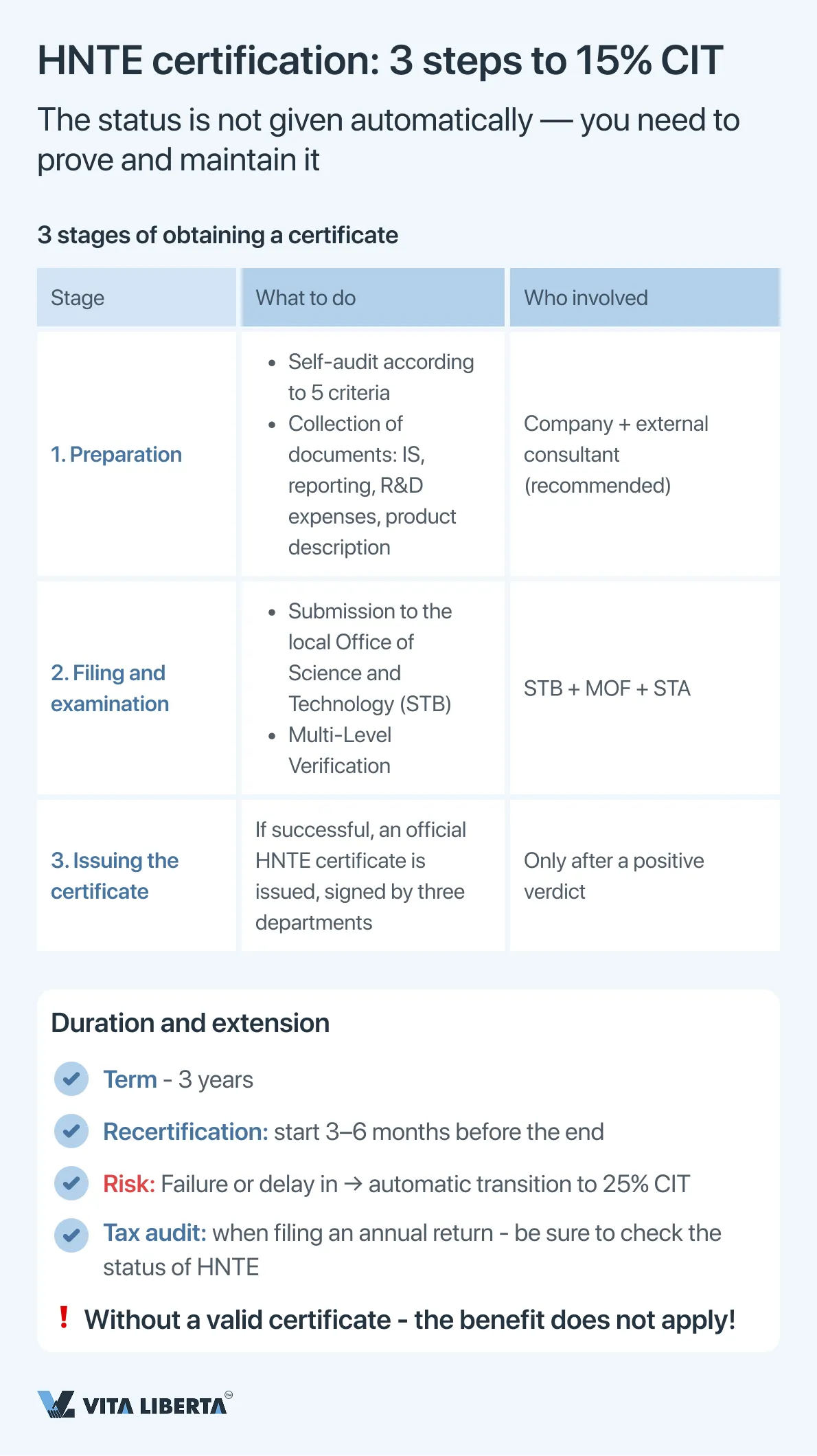 - 3-6 months before its expiration, the company is obliged to initiate and undergo a recertification procedure (re-assessment), which is similar in complexity to the primary one. Missing deadlines or failure to recertify lead to loss of status and automatic transition to the standard CIT rate of 25%.