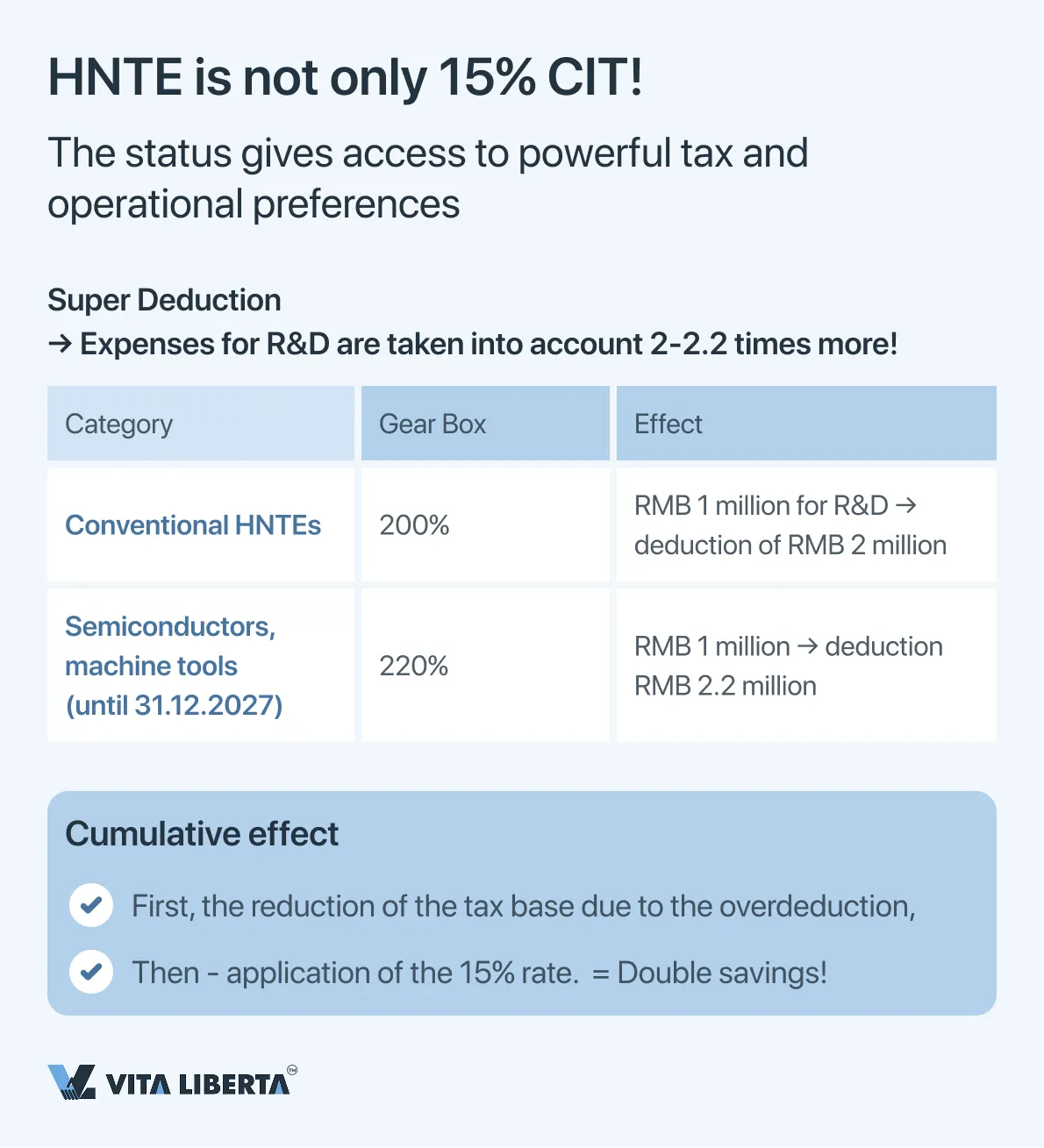 - Combination of benefits (Cumulative Benefit): Companies with the status of a high-tech enterprise (HNTE) are entitled to simultaneous application of: