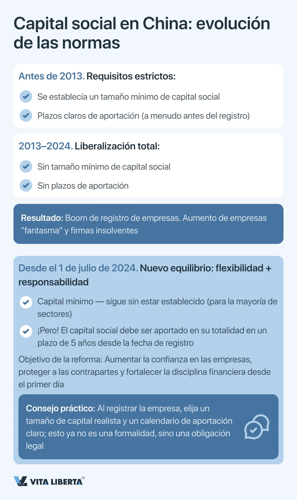 Antes de 2013, en China existía un sistema que obligaba a los fundadores a aportar el capital en plazos estrictamente establecidos y con umbrales mínimos. La reforma liberal de 2013 eliminó tanto los plazos como las cantidades mínimas para la mayoría de los sectores, dejando el proceso a discreción de los accionistas, lo que provocó un boom de registros, pero también generó riesgos asociados a las empresas “fantasma”. La nueva edición de la Ley de Sociedades de la RPC, en vigor desde el 1 de julio de 2024, marca un retorno al modelo regulado, pero en un formato actualizado.