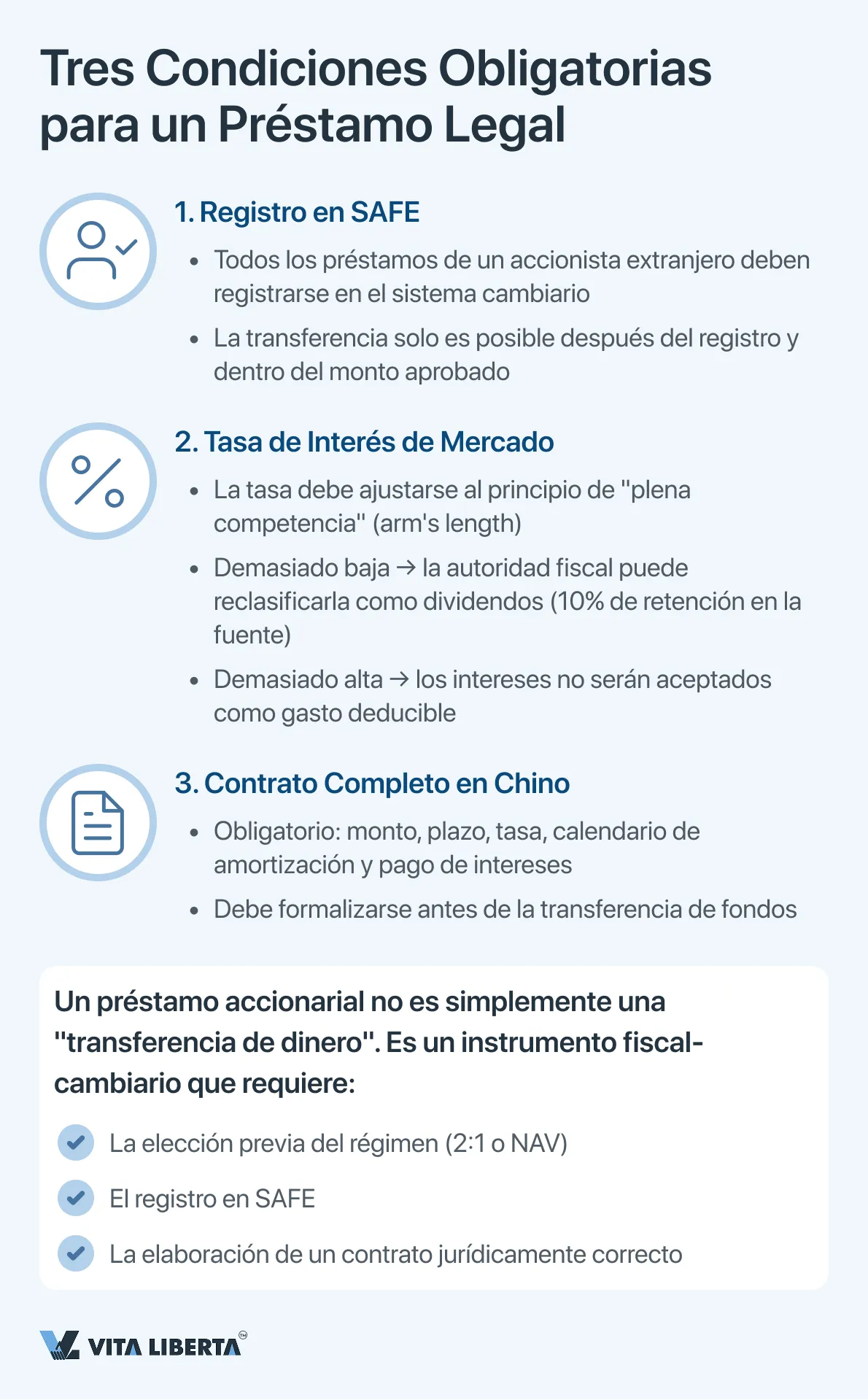 - Regulación Cambiaria. Todos los préstamos accionariales de un inversor extranjero están sujetos a registro en el sistema de control de divisas (SAFE). La transferencia efectiva de fondos solo es posible después de completar este registro y estrictamente dentro del monto registrado. El incumplimiento de este procedimiento conlleva multas graves y el bloqueo de operaciones.