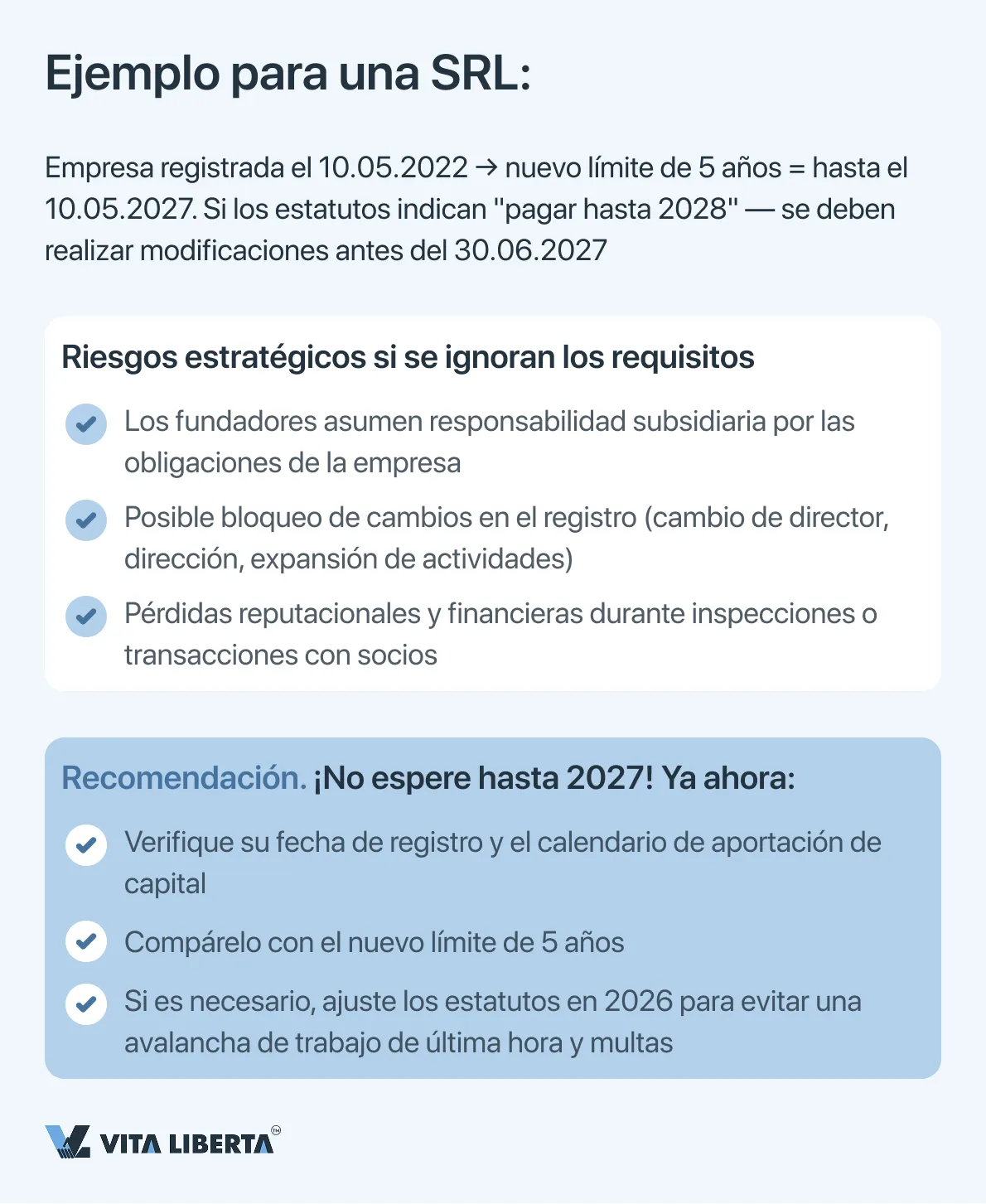 Matiz importante: Para las SRL cuyo calendario de pago existente ya se ajuste al nuevo límite de 5 años (contado desde su fecha de registro original), no se requiere una modificación formal de los estatutos. Sin embargo, se recomienda realizar una auditoría interna y obtener una confirmación de conformidad.