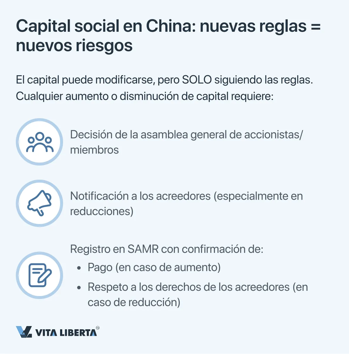 La información sobre cualquier cambio (en el monto del capital, la forma de aportación o el calendario de pago) debe ser divulgada por la empresa en el Sistema Nacional de Divulgación de Información Crediticia (www.gsxt.gov.cn) dentro de los 20 días hábiles siguientes a la modificación. Este registro es público y los datos son verificados por bancos, socios y reguladores. La falta de divulgación oportuna o la provisión de información falsa conduce a la inclusión de la empresa en la “lista negra” (de anomalías), a multas y al bloqueo de muchos trámites administrativos.