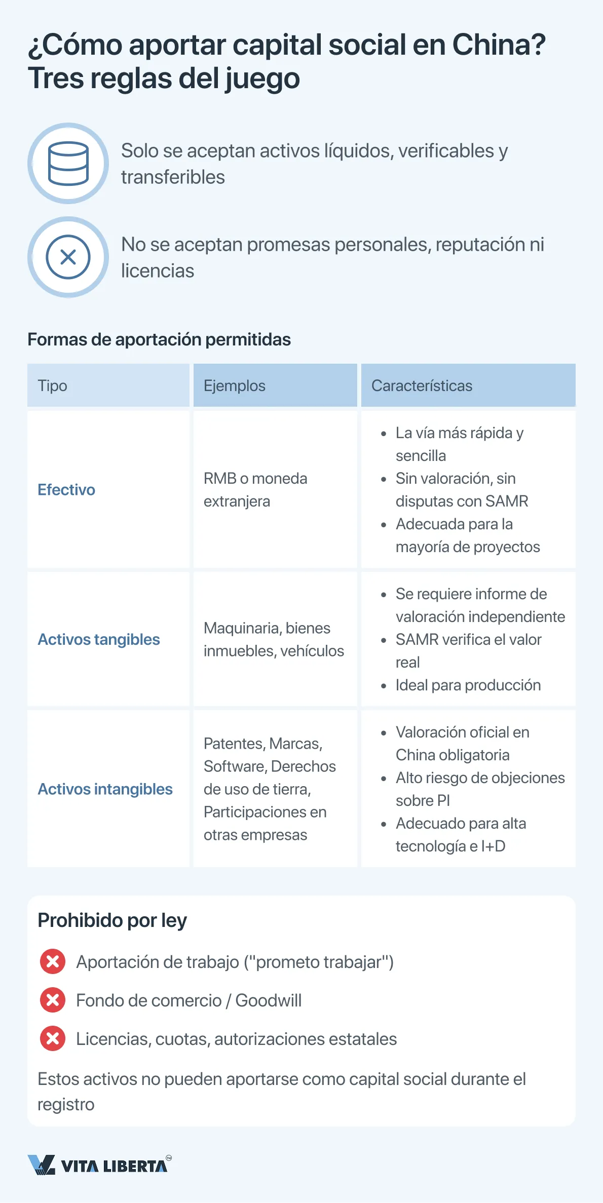 | 3. Formas de Aportación | Se puede: Dinero (lo mejor), equipos, propiedad intelectual, derechos sobre la tierra, participaciones en otras empresas. No se puede: Trabajo, reputación, promesas, licencias. | Dé preferencia a las aportaciones monetarias. Cualquier otro activo requiere una valoración independiente obligatoria en China. |