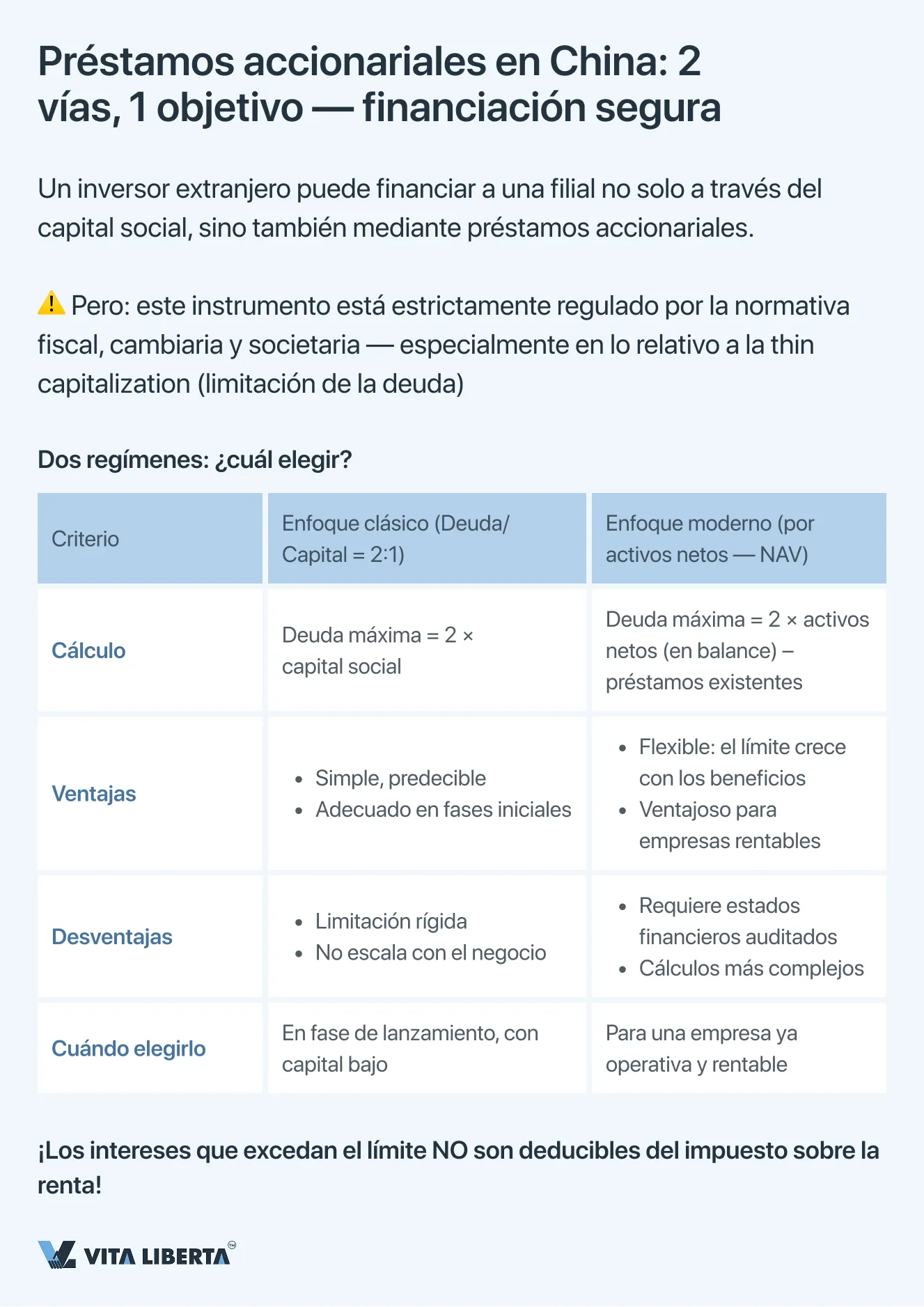 | Enfoque clásico: Relación fija “Deuda/Capital” (Debt-to-Equity Ratio) | Establece una relación máxima directa entre los fondos prestados por los accionistas y el capital social (a menudo 2:1 para empresas manufactureras). Consecuencias fiscales: Los intereses de los préstamos que excedan el límite establecido no se reconocen como gasto a efectos del cálculo del impuesto de sociedades en China. | Ventajas: Simplicidad y previsibilidad. Fácil de calcular y entender al inicio del proyecto. Limitaciones: Poca flexibilidad. No considera la escala real y rentabilidad del negocio, puede limitar artificialmente la financiación de empresas en crecimiento. |