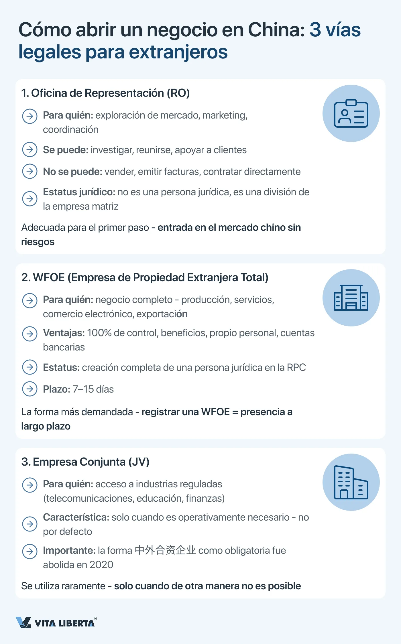 Para llevar a cabo un negocio a largo plazo e independiente con derecho a ventas, contratación de personal y obtención de beneficios, la opción óptima es una WFOE (Empresa de Propiedad Extranjera Total). Esta es una persona jurídica china completa con capital 100% extranjero, que otorga control total sobre el negocio. Una Oficina de Representación (RO) no permite realizar actividades comerciales, y una Empresa Conjunta (JV) hoy en día se utiliza principalmente para acceder a sectores regulados por la ley (por ejemplo, telecomunicaciones o educación).