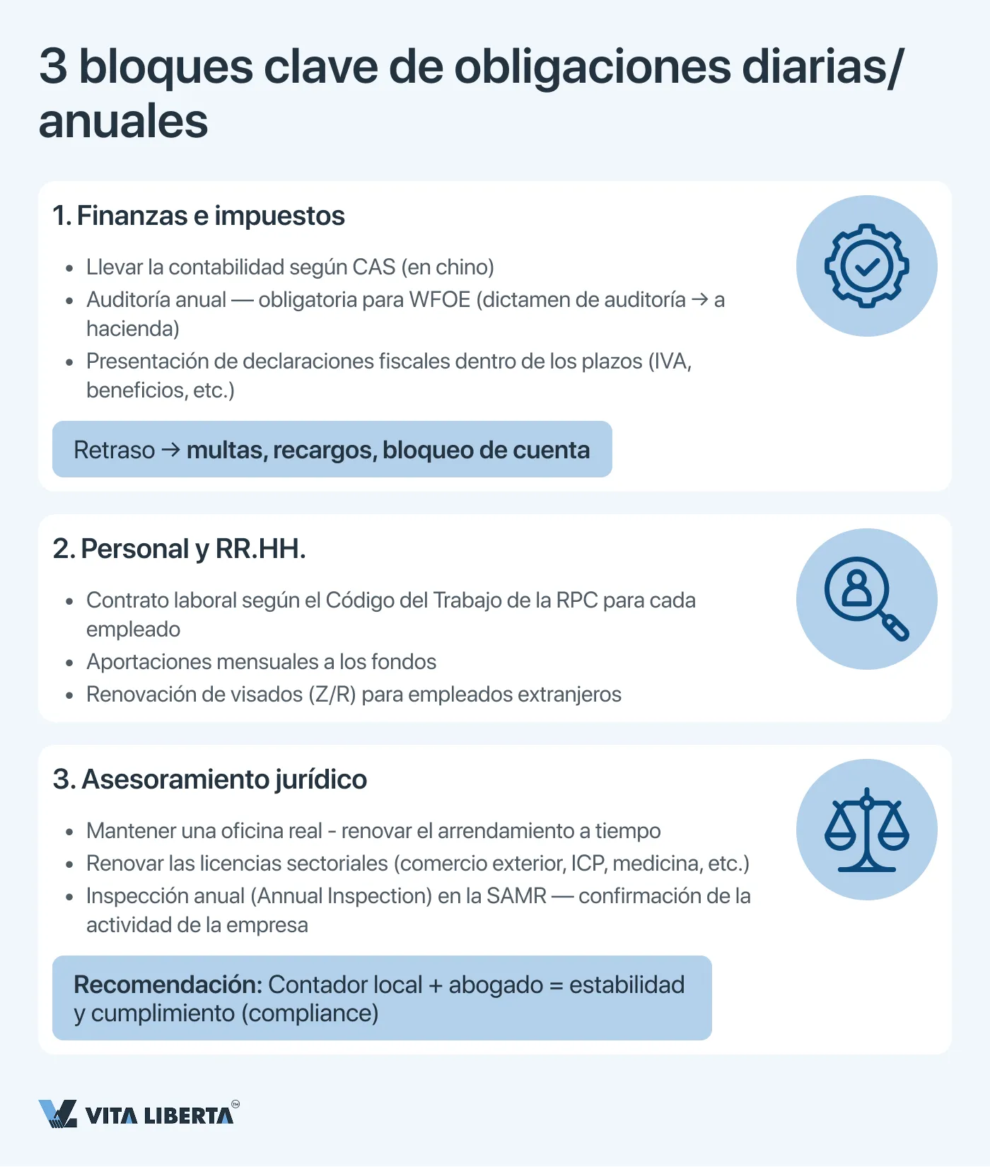 - Finanzas e impuestos: Llevar la contabilidad según los estándares chinos (CAS), presentar informes fiscales periódicos y una auditoría anual obligatoria para las WFOE.