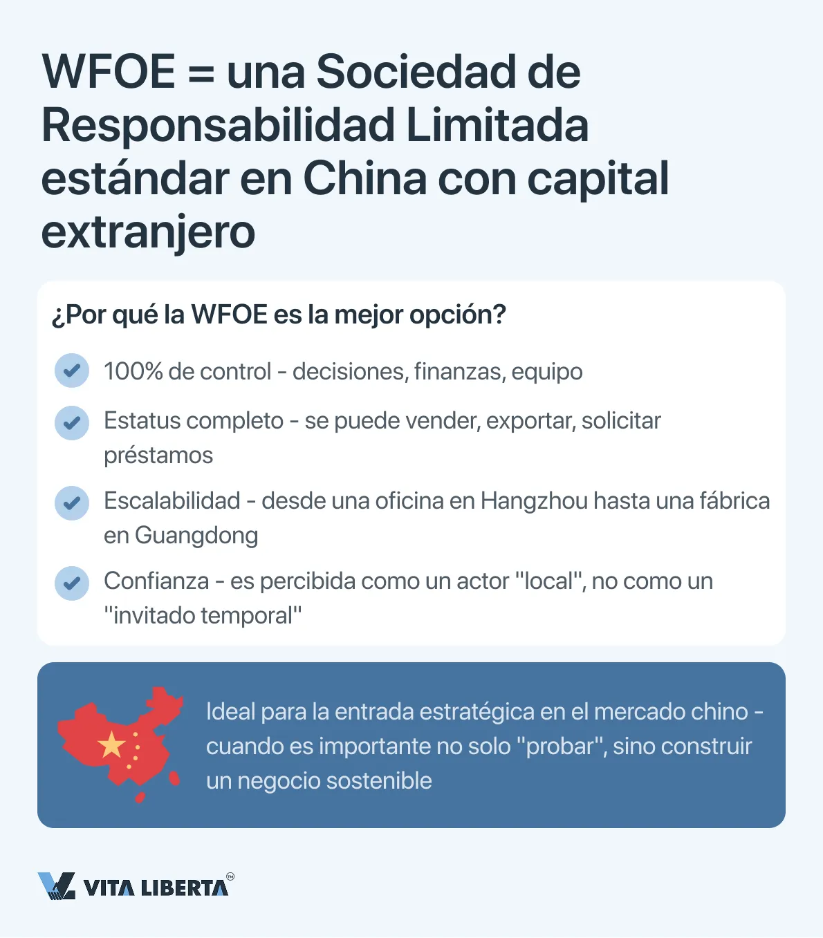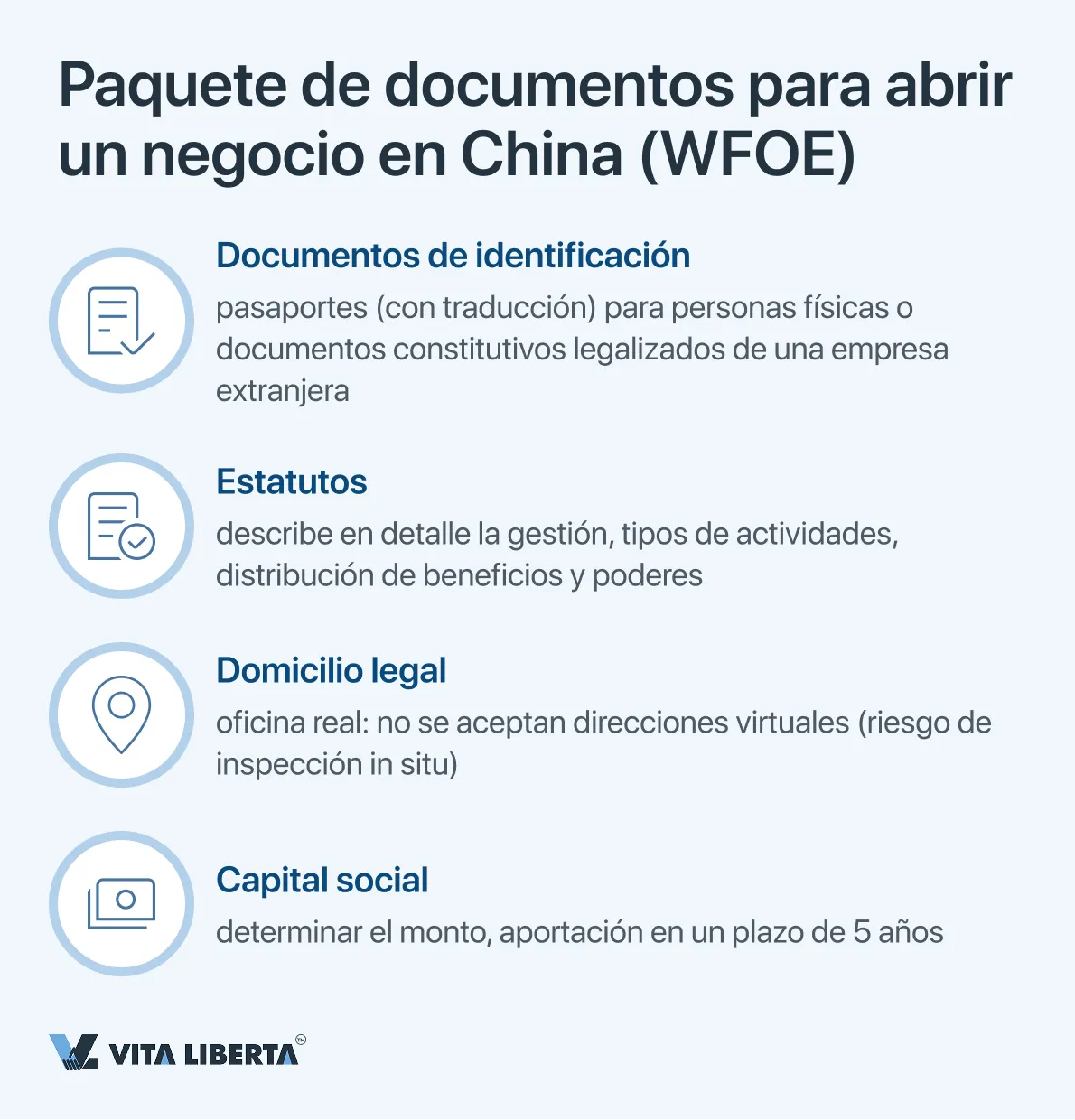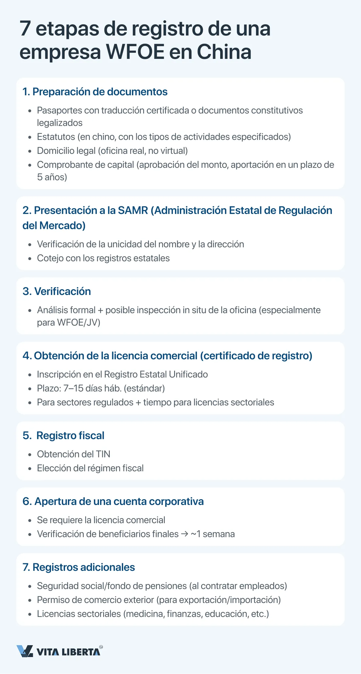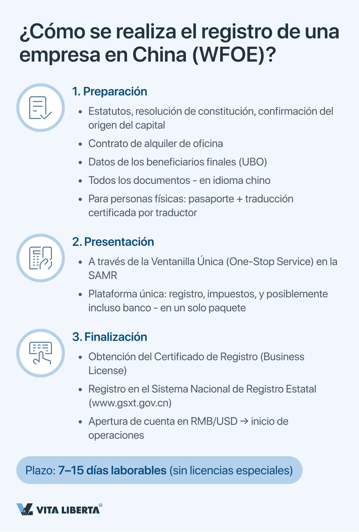 Importante: desde 2020 se ha abolido el Certificado de Aprobación (Approval Certificate); en su lugar es suficiente el registro en el Sistema Nacional de Información Pública sobre Empresas (www.gsxt.gov.cn). La WFOE no es un “régimen especial”, sino una Sociedad de Responsabilidad Limitada estándar con capital extranjero.