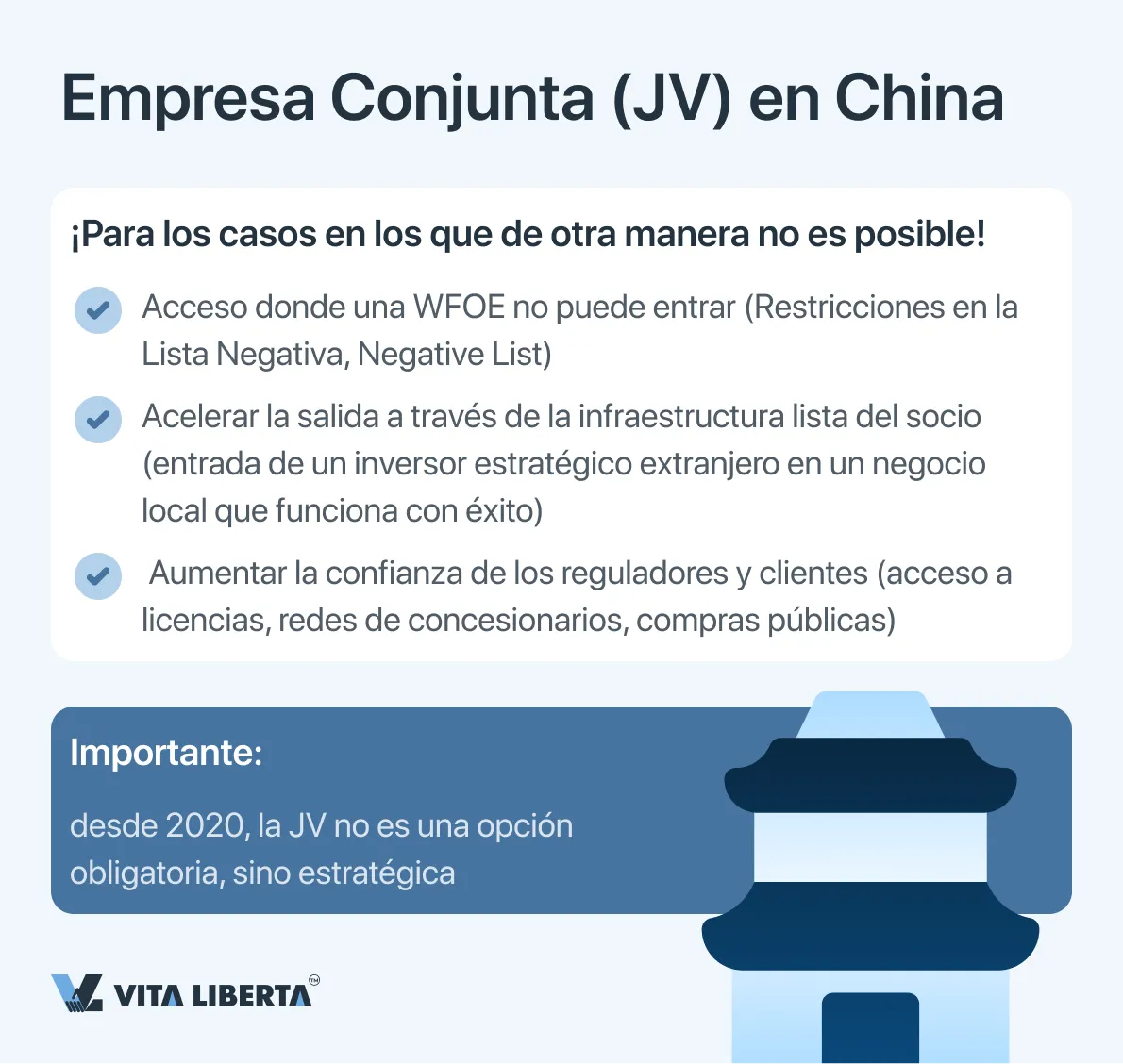 Aunque con la aprobación de la Ley de Inversión Extranjera (Foreign Investment Law, 2020) se eliminó la creación obligatoria de JV en la mayoría de los sectores, sigue siendo una herramienta clave en los segmentos incluidos en las Medidas Administrativas Especiales (Lista Negativa, Negative List), aprobadas por MOFCOM y NDRC (ed. 2025).