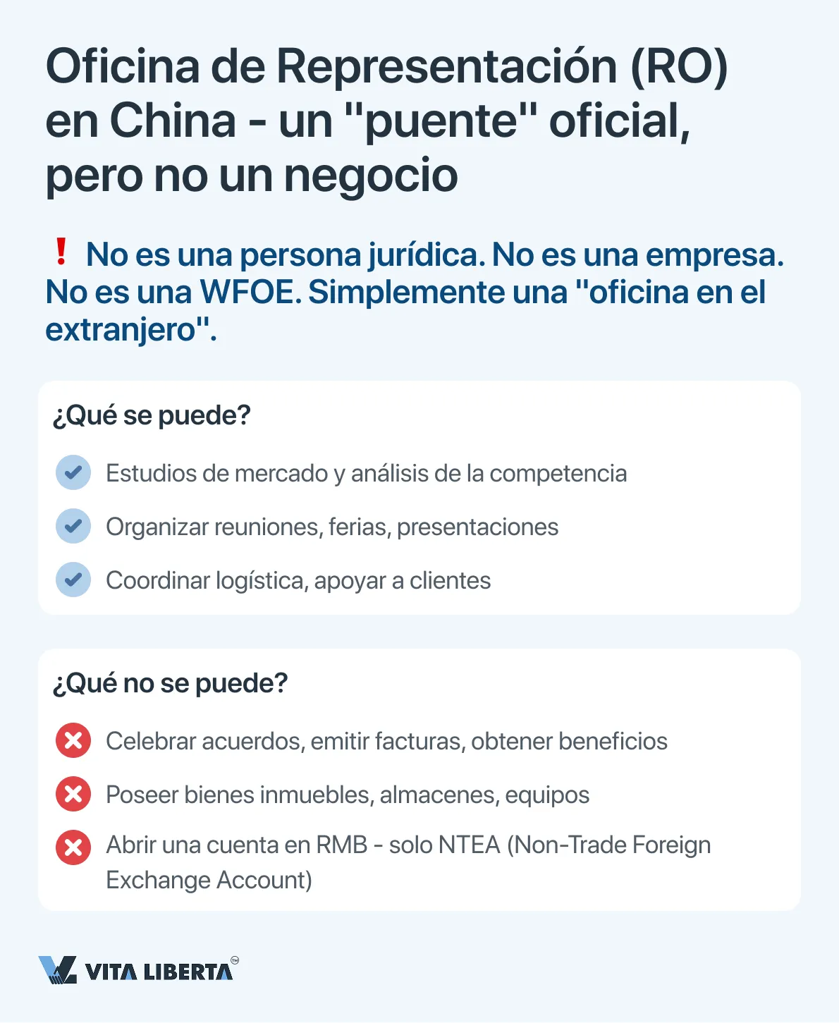 Una Oficina de Representación (Representative Office, RO) no es una persona jurídica, sino una subdivisión territorial de una empresa extranjera, oficialmente acreditada en la RPC para actividades no comerciales. Actúa en nombre de la oficina central y no posee personalidad jurídica independiente.