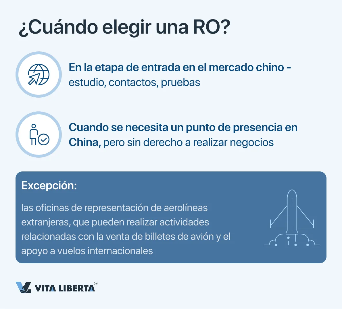 - Una Oficina de Representación (RO) no es una persona jurídica, sino solo una subdivisión acreditada de una empresa extranjera. No puede realizar actividades comerciales (vender, obtener beneficios), y está destinada solo a marketing, investigación y apoyo al cliente. El proceso de acreditación toma 20-45 días. Una RO es una herramienta para la “exploración” del mercado, no para realizar negocios.
