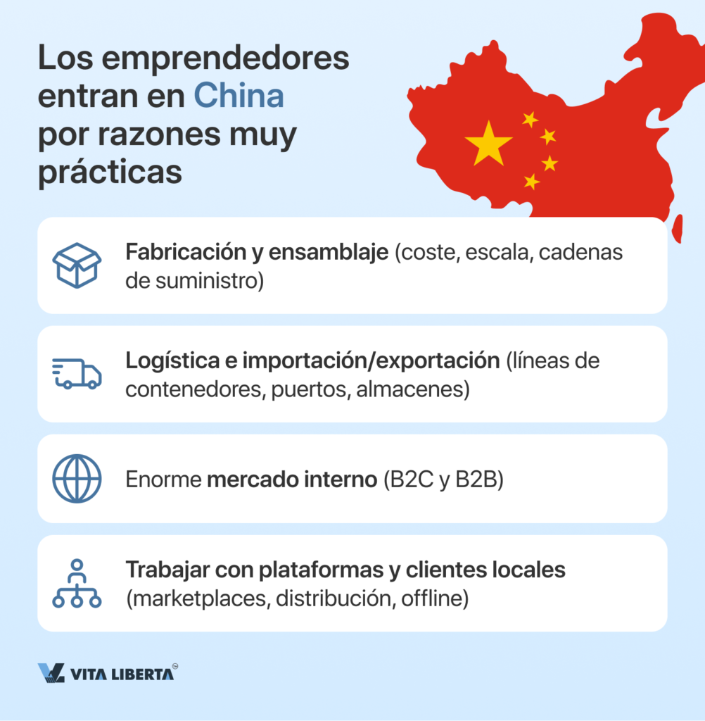 - Comercio internacional con fábricas chinas. Compras en la RPC — vendes a otros países, y tu oficina de ventas no está en China.