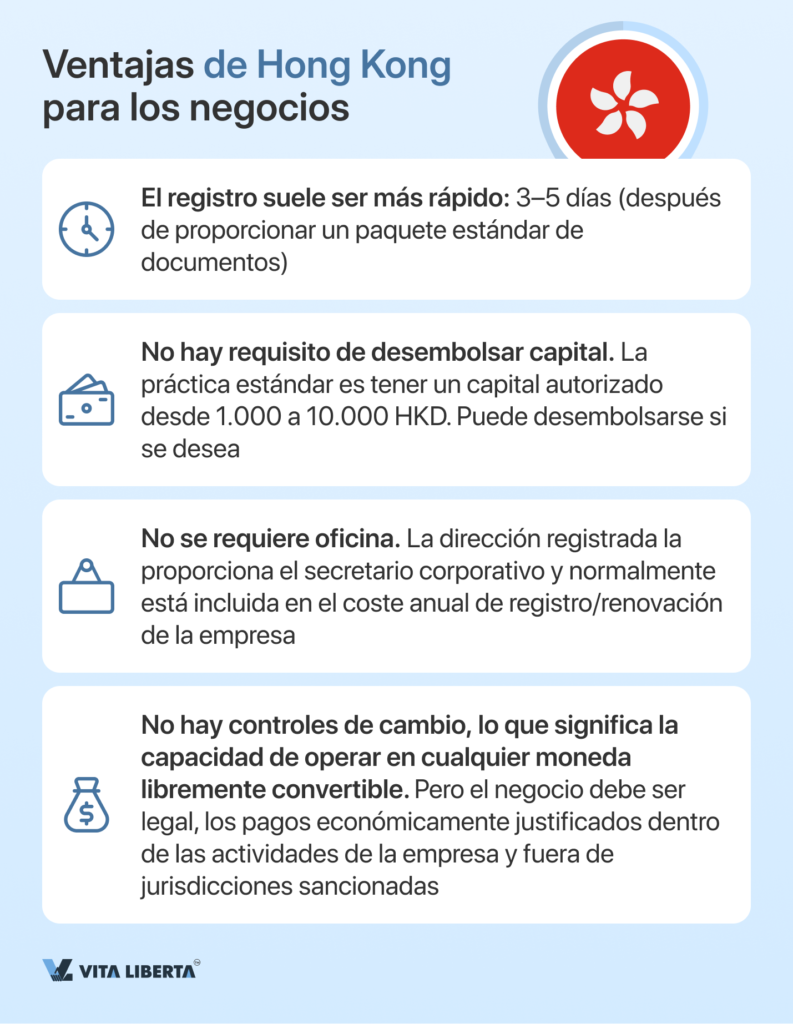 Hong Kong, mientras tanto, es formalmente parte de China pero tiene un sistema legal y fiscal separado y su propia infraestructura financiera. Esto explica la popularidad del modelo: “trabajamos con China, pero mantenemos la empresa en Hong Kong”. Legalmente, es más fácil celebrar contratos internacionales, recibir pagos en divisas y construir una estructura de holding.