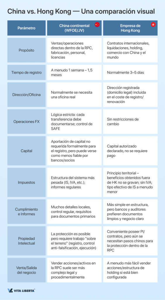 Es importante entender: Hong Kong no reemplaza las operaciones en China continental si realmente necesitas una presencia física “sobre el terreno” (oficina, personal, ventas dentro de la RPC, fabricación). Pero a menudo aborda tareas donde una empresa continental se vuelve demasiado engorrosa.