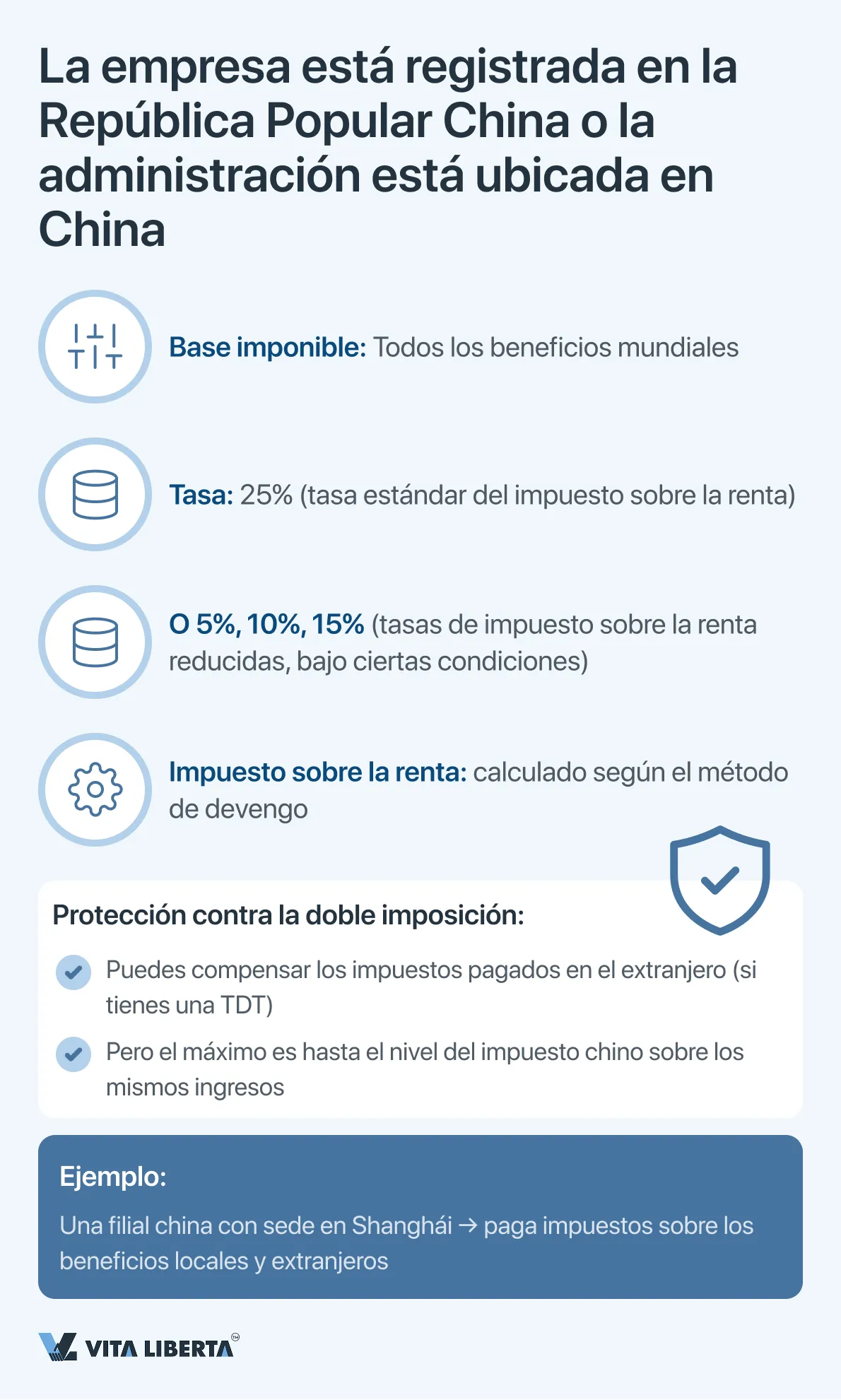 Empresa residente fiscal (TRE): esta categoría incluye empresas registradas bajo las leyes de la República Popular China, o aquellas cuya administración real se encuentra en China. Los TRE están sujetos al principio de tributación mundial. Esto significa que están obligados a declarar y pagar impuestos en China sobre todos sus beneficios obtenidos tanto a nivel nacional como en el extranjero. Para evitar la doble imposición con renta extranjera, se aplica un crédito por impuestos pagados en el extranjero (con restricciones).