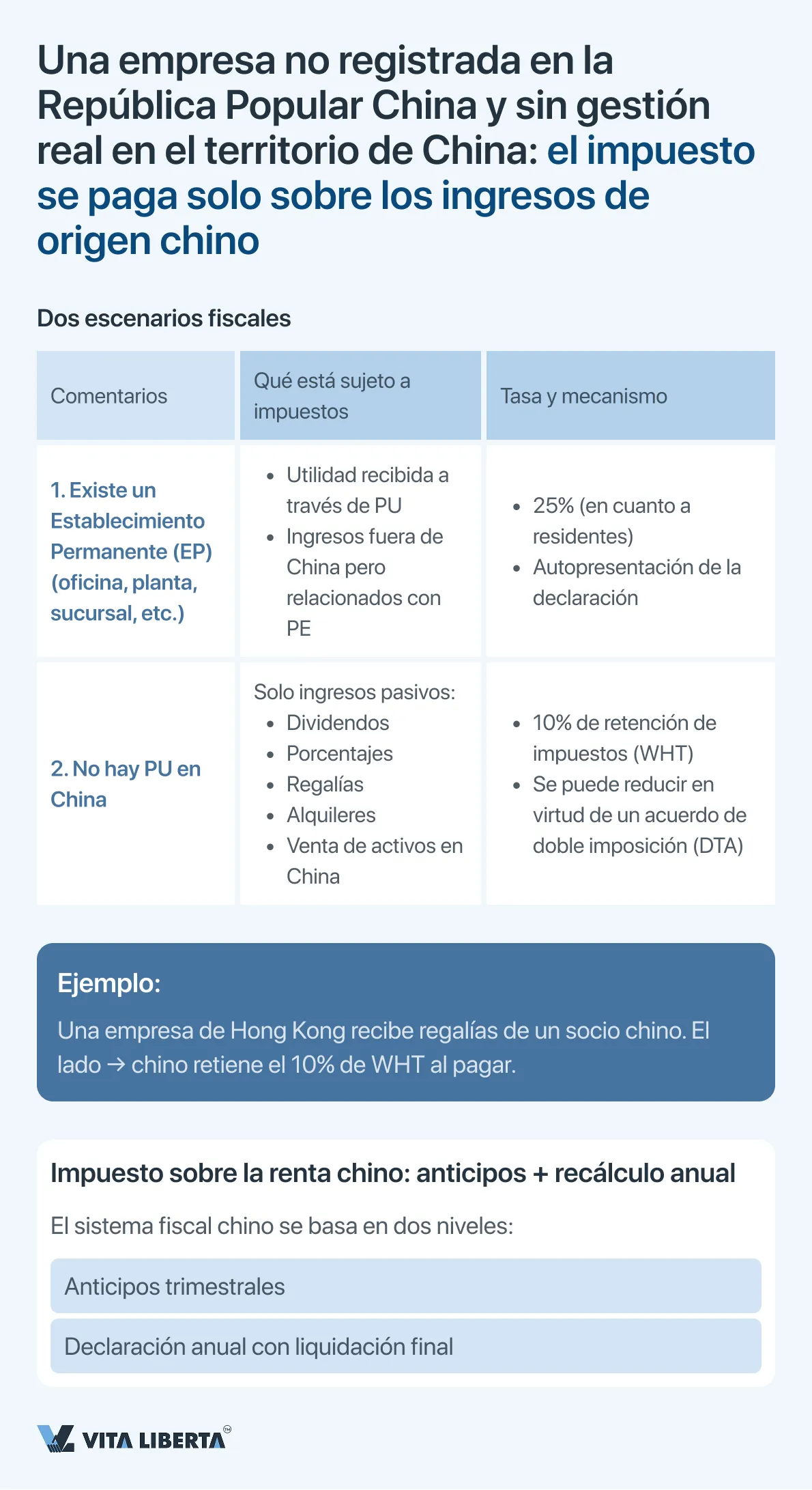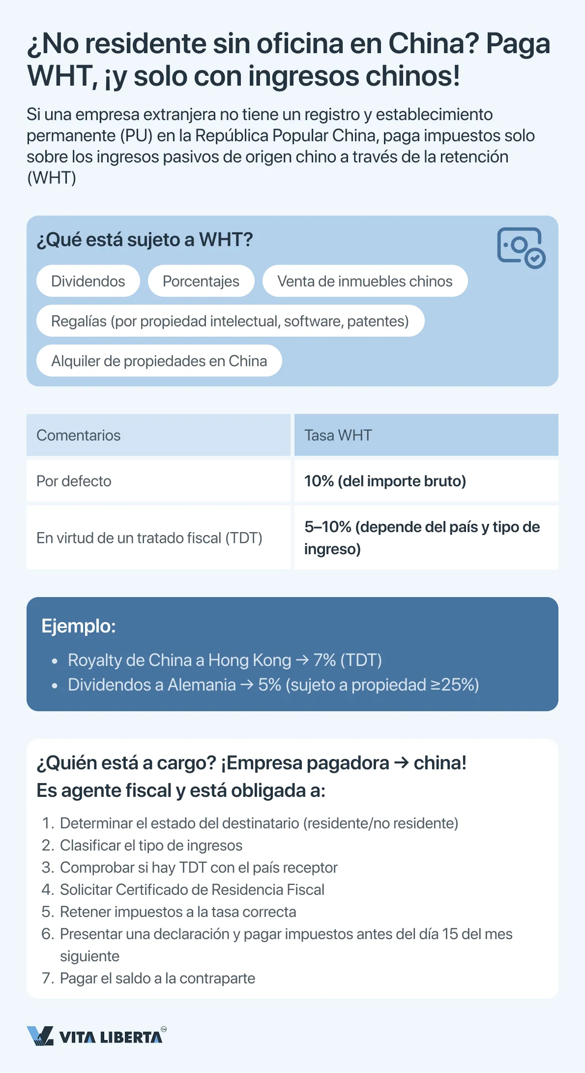 Para las empresas extranjeras que no son residentes fiscales de la República Popular China (no Tre) y no tienen un establecimiento permanente (PI) en China, se aplica un régimen especial de tributación de los ingresos de origen chino. El mecanismo principal es la Retención de Impuestos (WHT).