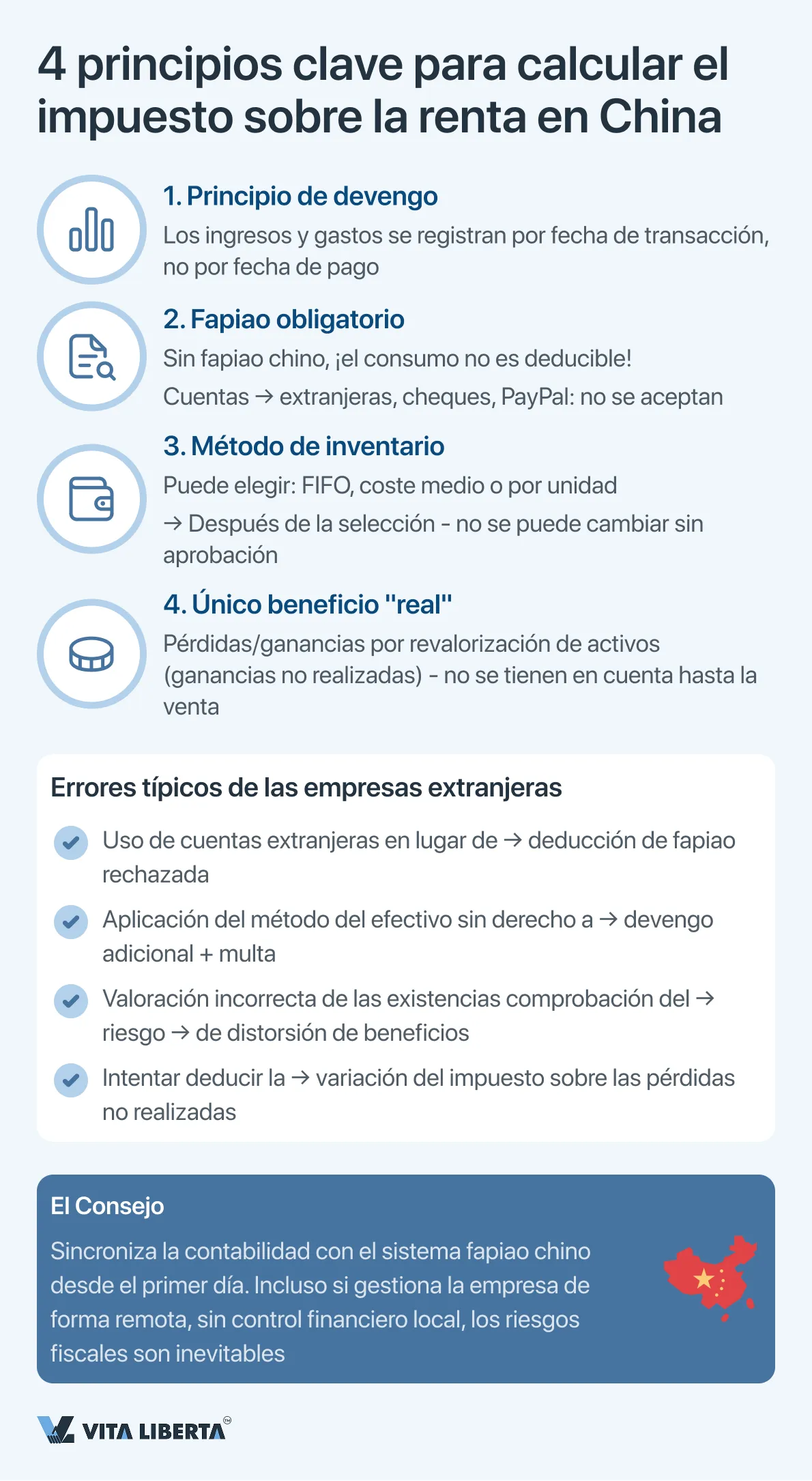 Cualquier gasto deducible para reducir la base imponible debe confirmarse mediante facturas fiscales oficiales chinas (fapiao). Los cheques, facturas extranjeras, pagos de PayPal, etc. no son aceptados por las autoridades fiscales como base para la deducción. La ausencia de una fapiao correcta hace que los gastos no sean deducibles.