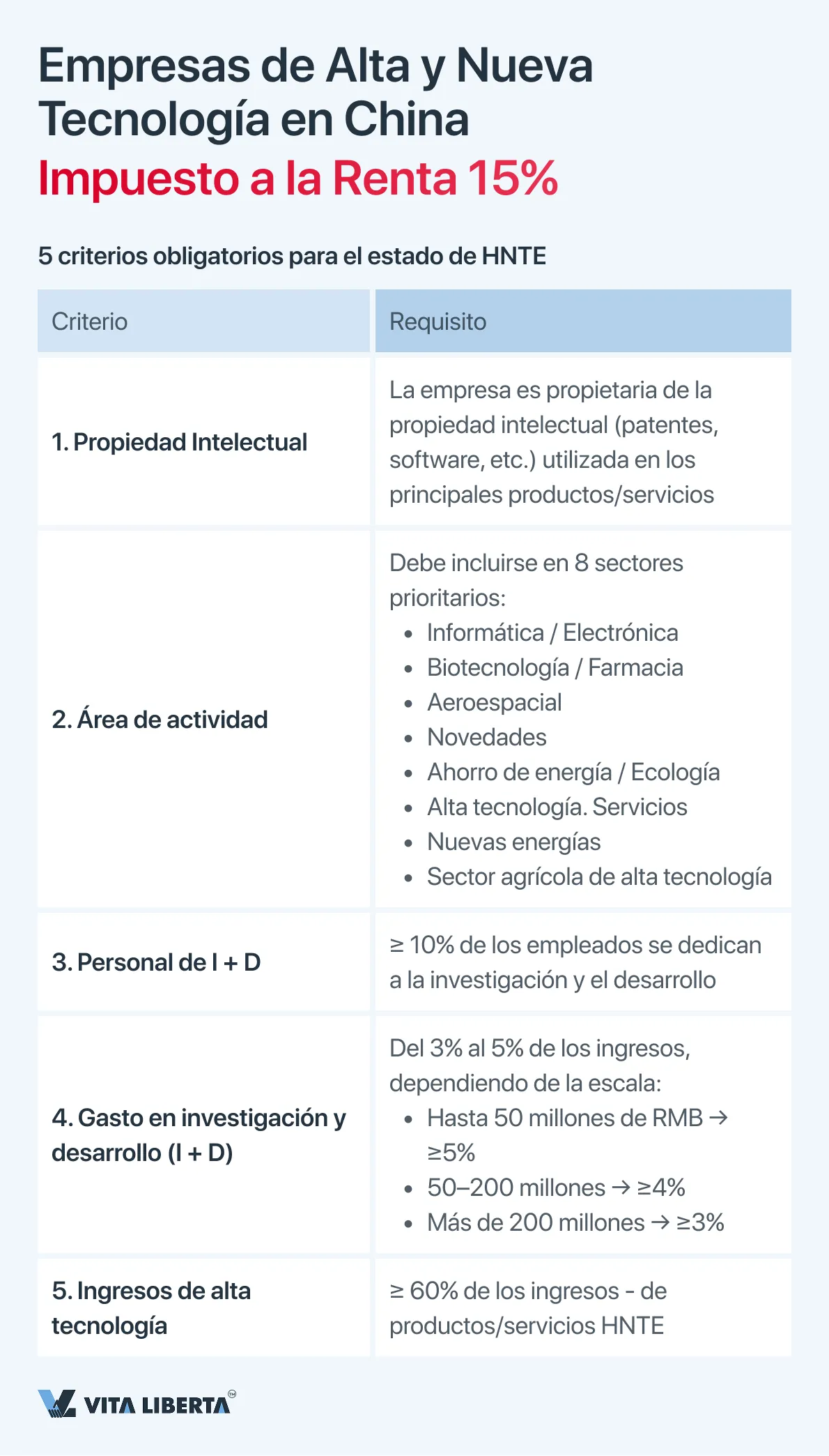 | Plazo extendido (10 años) | Para empresas de alta tecnología (HNTE) y pequeñas empresas de tecnología. | Se requiere una aclaración estricta: no todos los HNTE son elegibles para una prórroga de 10 años, sino una categoría más estrecha, la National Tech SME.Criterios clave de Tech SME: • Ingresos anuales ≤ 200 millones de yuanes (~$28 millones). • Número de empleados ≤ 300 • El valor contable de los activos es ≤ 400 millones de yuanes. |