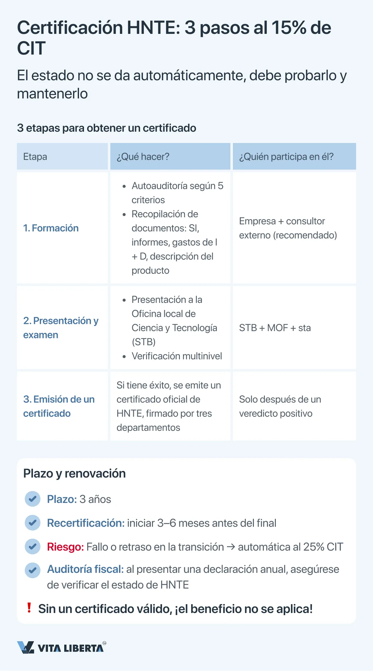 - Obtención de un certificado: en caso de decisión positiva de la empresa, se emite un Certificado HNTE, firmado por los tres departamentos especificados. Este certificado es la única base legítima para aplicar un tipo impositivo preferente.