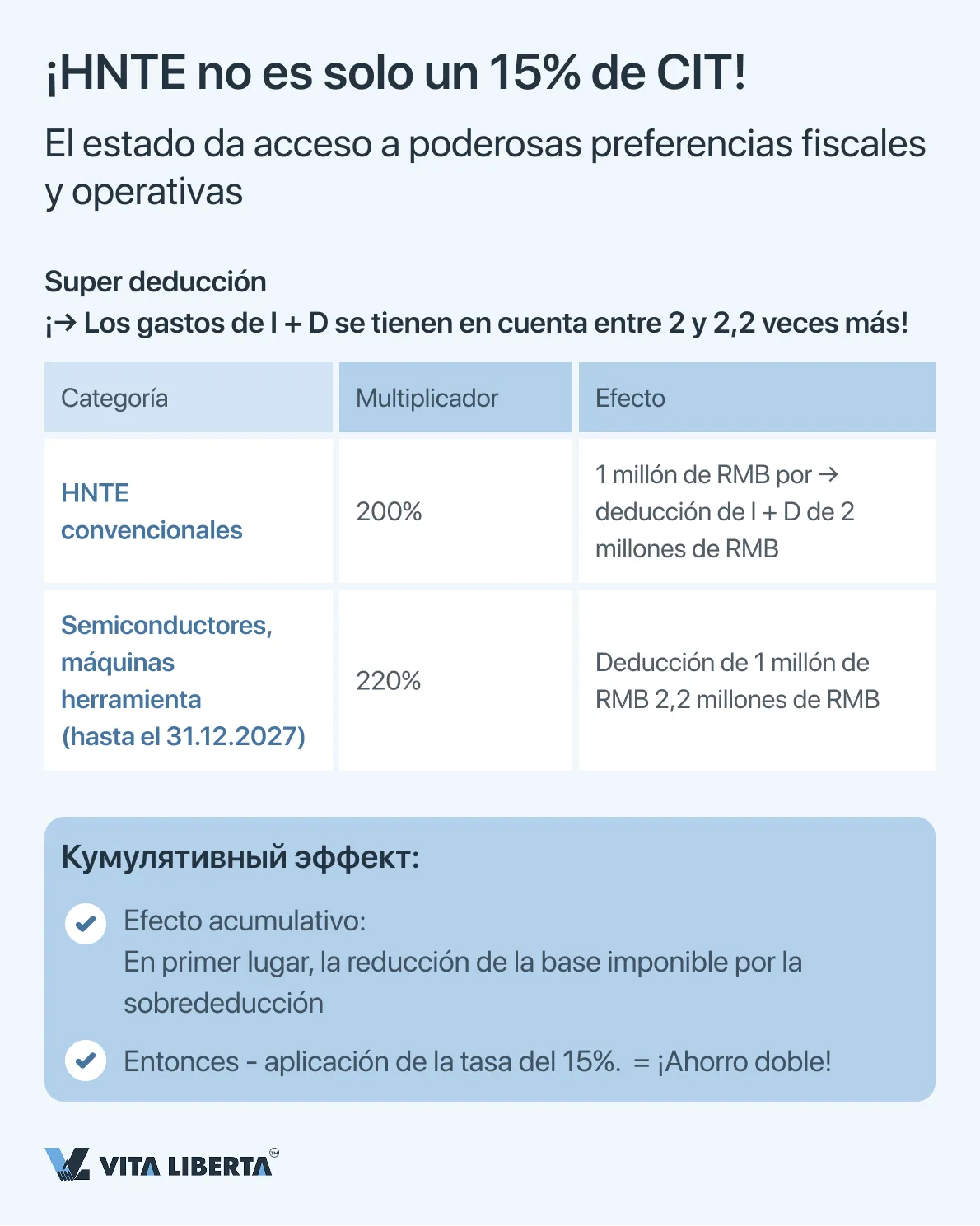 - Combinación de beneficios (Beneficio acumulado): Las empresas con el estatus de empresa de alta tecnología (HNTE) tienen derecho a la aplicación simultánea de: