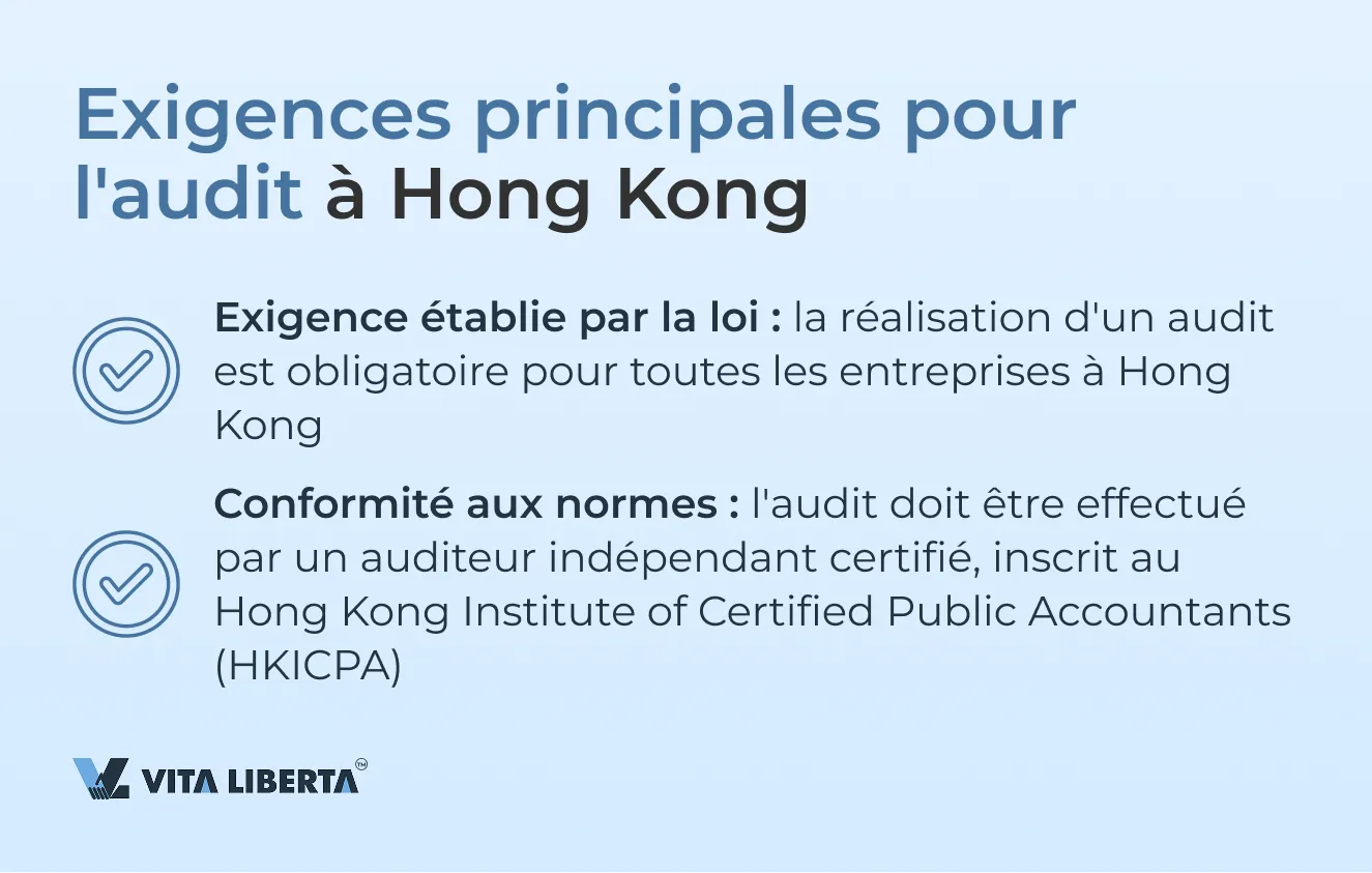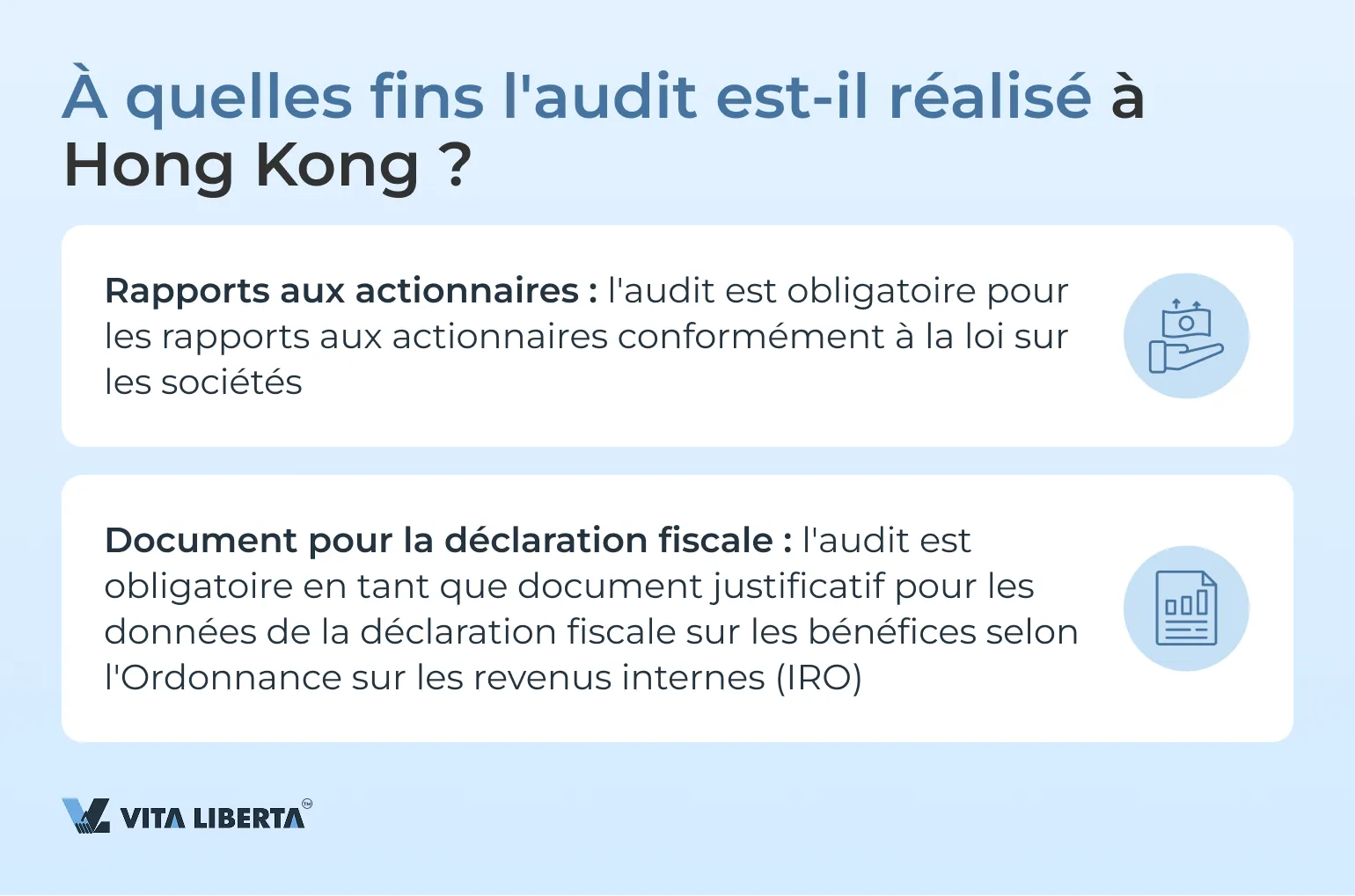 Selon l’Ordonnance sur les sociétés de Hong Kong (CO), l’audit annuel des états financiers est obligatoire pour toutes les sociétés. En plus de cette exigence, l’Ordonnance sur les revenus internes (IRO) oblige les sociétés à Hong Kong à présenter des états financiers audités lors du dépôt de leur déclaration fiscale (PTR).