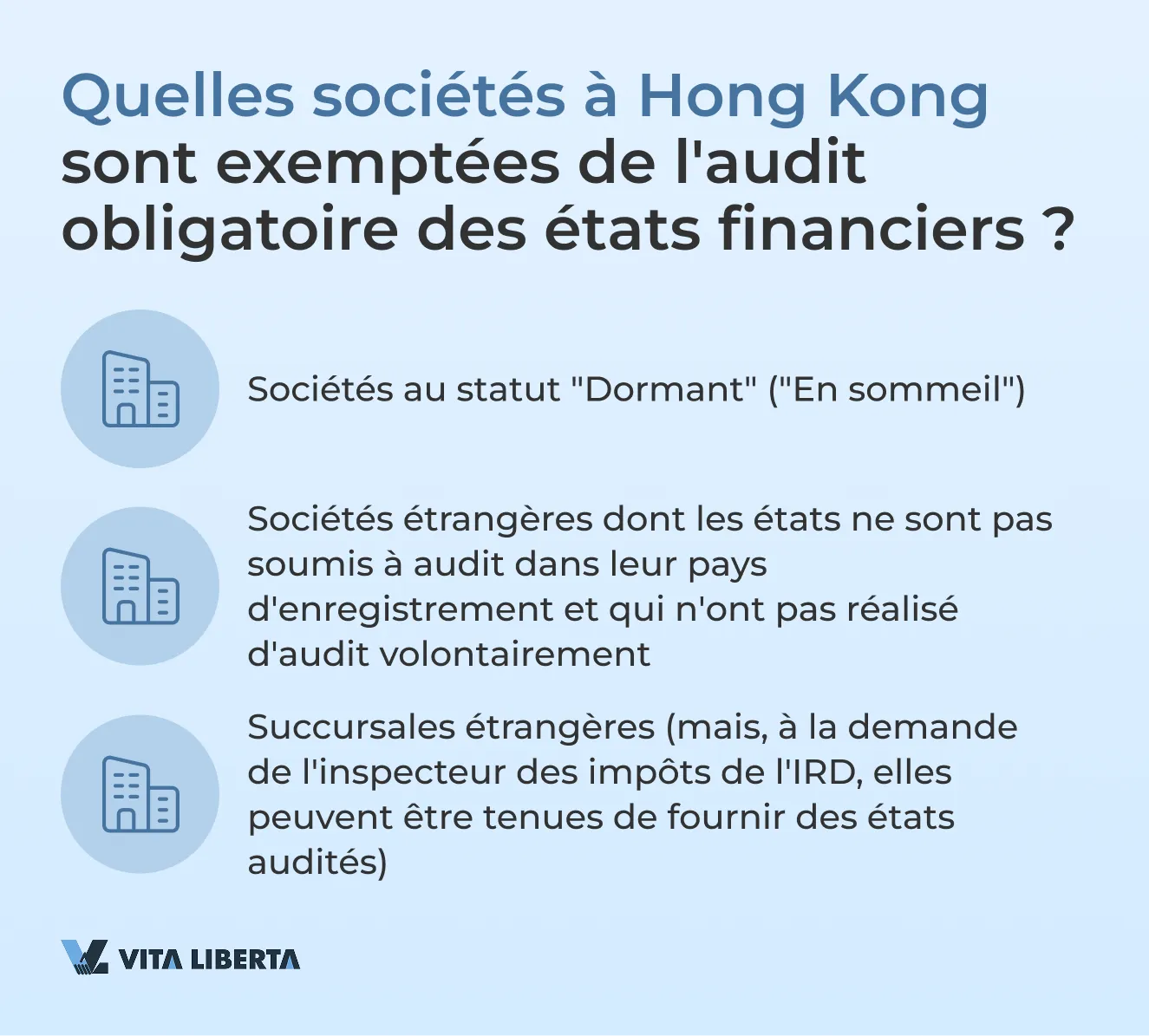 | Exemptions | Sociétés “Dormant” | Sociétés “Dormant” ;Sociétés enregistrées dans des pays qui n’imposent pas d’audit obligatoire des états et qui n’ont pas réalisé d’audit volontairement ;Succursales de sociétés étrangères à Hong Kong (peuvent être demandées si nécessaire par l’inspecteur des impôts). |