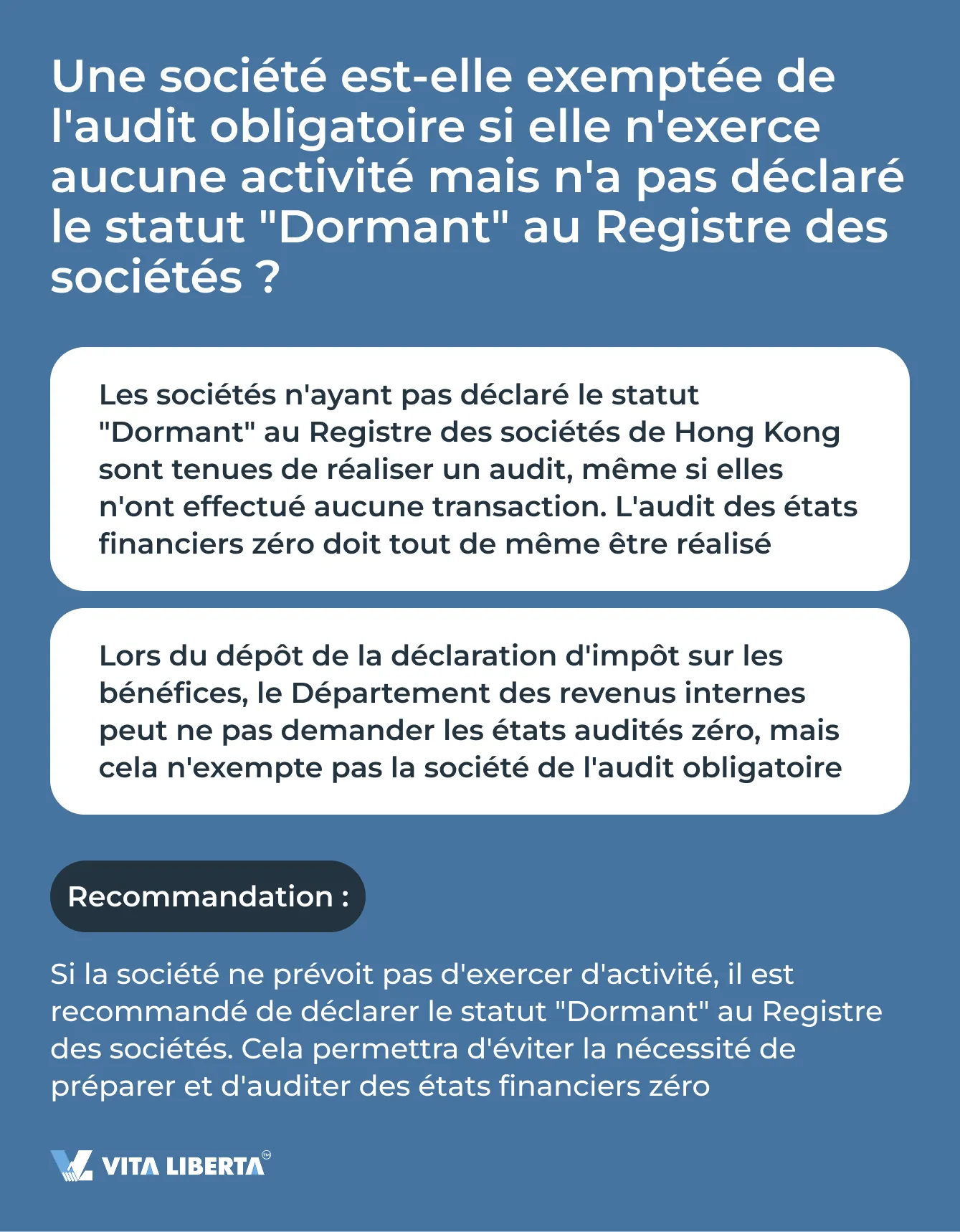 Le fait qu’une société de Hong Kong n’ait aucune activité, et que ses fondateurs et dirigeants n’aient pas adopté de résolutions spéciales ni informé le Registre des sociétés de Hong Kong du statut dormant, n’est pas une raison pour laquelle la société peut être exemptée de l’audit obligatoire des états financiers.
