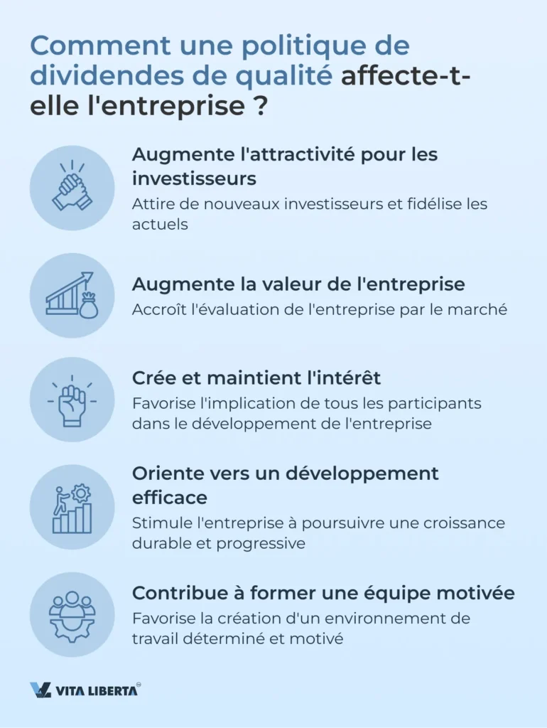 Attirer de nouveaux investisseurs grâce aux paiements de dividendes aide également l’entreprise à augmenter sa capitalisation boursière et à accéder à un plus grand volume de ressources pour son développement. En retour, l’application pratique des paiements renforce la confiance des actionnaires actuels envers l’entreprise, qui voient que leurs investissements contribuent à augmenter la valeur de l’entreprise.