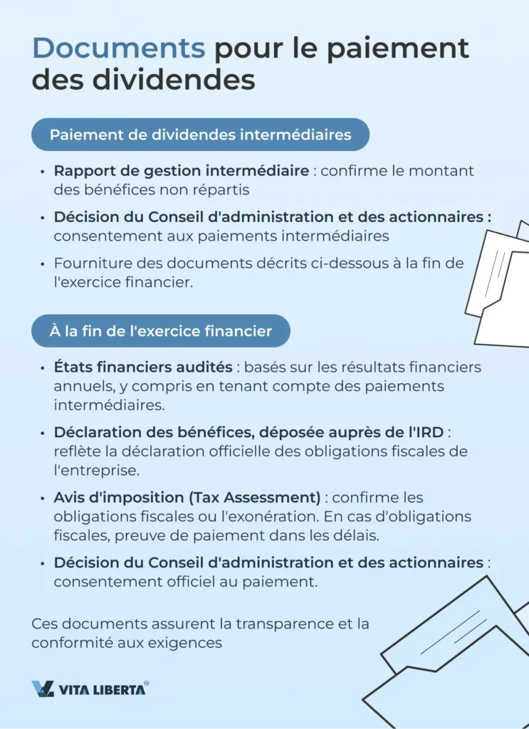 Ces documents assurent la transparence et la légalité du processus de paiement des dividendes, ainsi que la conformité aux exigences fiscales et corporatives.